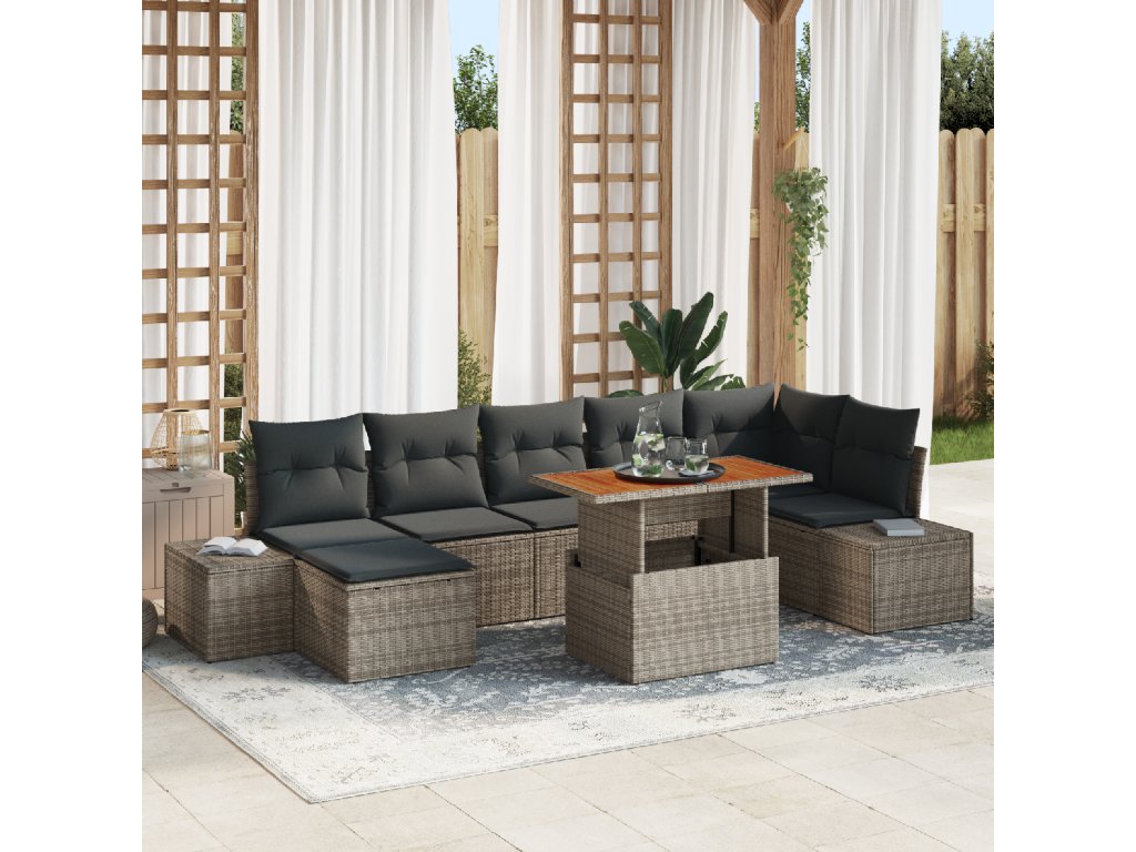 Materiály: Vyrobeno z polyratanu a masivního akáciového dřeva, tento gauč je stavěný tak, aby něco vydržel. Polyratan skvěle odolává UV záření, takže si ho užiješ na slunci roky, a masivní akáciové dřevo navíc dodává kouzlo přírody. Součásti: Obsahuje pohodlné polštáře s pěnovým výplní, pevné opěrky rukou a modulární uspořádání, které si můžeš přizpůsobit podle sebe. Dostaneš dva boční gauče, jednu rohovou sedačku, tři středové sedačky, podnožku a stůl se úložným prostorem pro všechny tvoje věci. Vlastnosti / Funkce / Design: Nastavitelné nohy jsou perfektní pro vyřešení výšky a stability na nerovném terénu. Kousky můžeš různě kombinovat a vymyslet ideální uspořádání pro cokoliv, ať už je to obyčejné sezení nebo slavnostní zahradní párty. Doporučené použití: Tato sada je perfektní na venkovní prostory jako zahrady a terasy, ideální na slunečné dny nebo i chladnější jarní večery. Je skvělá na grilování nebo jen na čtení knihy obklopený přírodou, takže ti udělá službu na spoustě venkovních aktivit. Údržba: Aby to vypadalo skvěle, je fajn používat kryty, když to nepoužíváš. Tím se postaráš, aby ti to sloužilo suitable for co nejdéle a vypadalo to pořád hezky.- Barva: Šedá a hnědá