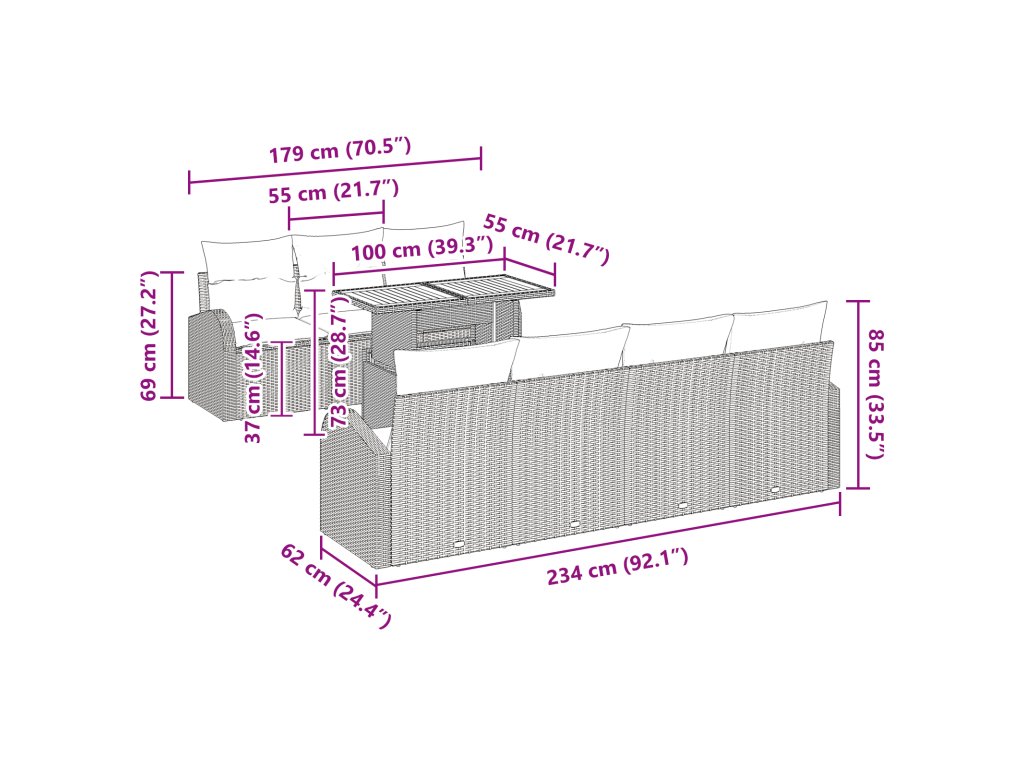 Materiály: Vyrobeno z poly ratanu a práškově lakované oceli, tento zahradní set myslí na odolnost i styl. Poly ratan zajišťuje, že zvládne různé počasí a vypadá přitom skvěle. Ocelový rám dodává pevnost, takže je to skvělý doplněk pro vaši zahradu nebo terasu. Akátové povrchy dodávají nádech přírodní elegance. Součásti: Set obsahuje čtyři pohovky na rukou, tři středové sedačky (všechny s vestavěným úložným prostorem) a zahradní stůl, takže máte pokryté všechny potřeby venkovního sezení. Každý kus je pečlivě vyrobený pro praktické používání, a úložný prostor je super užitečný pro venkovní život. Funkce / Použití / Design: UV odolné materiály zajišťují, že set vypadá skvěle a odolává vyblednutí od slunce. Odnímatelné polštáře se snadno udržují, takže je můžete jednoduše vyčistit nebo vyměnit. Doporučené použití: Tento zahradní set je ideální pro venkovní prostory a skvěle funguje jak v útulných, tak prostorných zahradách. Ať už si užíváte snídaně nebo večerní party, vypadá dobře na každém venkovním místě a poskytuje pohodlné sezení. Údržba: Aby set zůstal v top stavu, zakryjte ho, když se nepoužívá, a občas ho otřete vlhkým hadříkem. Trochu péče zajistí, že s vámi vydrží a nabídne skvělé zážitky každé jaro a léto.- Barva: Šedá