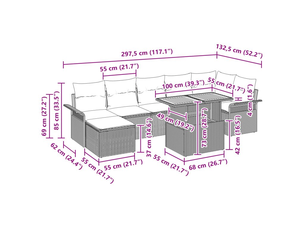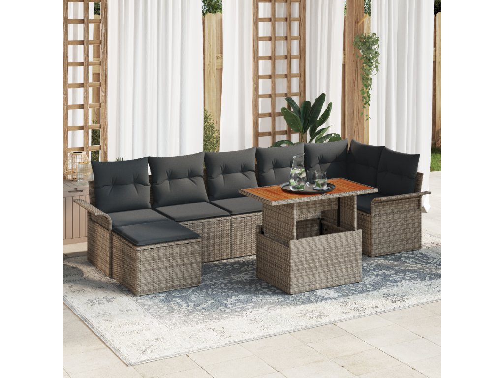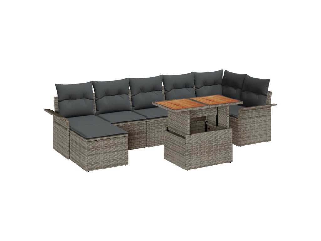 Prémiové materiály: Vyrobeno z polyratanu a masivního akáciového dřeva. Polyratan je odolný vůči UV záření a počasí, ideální pro venkovní používání. Akáciové dřevo přidává na odolnosti a teple designu. Kompletní sestava: Sada obsahuje dva arm pohovky, rohové sedadlo, tři středové sedáky, taburet a zahradní stůl – dost místa pro všechny. Každý kus má zaoblené hrany, takže se hodí do každé uspořádání. Materiály pro opření zajišťují pohodlí s rodinou nebo přáteli. Funkční stůl: Nastavitelný stůl se snadno mění z kávového na jídelní. Ideální pro ty, kdo ocení flexibilitu a využití prostoru. Vhodné použití: Perfektní na terasy, zahrady a dvorky, tato sada vytváří stylové prostředí pro venkovní stolování nebo relaxaci. Modulární design usnadňuje přemisťování a přizpůsobení na různé akce. Údržba: Chraňte nábytek krytem, když ho nepoužíváte. Pravidelně udržujte, aby zůstal v dobrém stavu a sloužil vám další sezóny.- Barva: Šedá