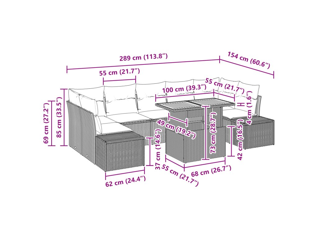 Materiály: Kombinace poly ratanu, kovu s práškovou úpravou a pevným akáciovým dřevem, tato sada je navržena pro trvanlivost a atraktivitu. Materiály byly pečlivě vybrány pro svou odolnost vůči UV záření, což zajišťuje, že sada zůstane vynikajících podmínkách po celou sezónu. Součásti: Sada zahrnuje dvě boční pohovky, dvě rohové sedadla a tři střední sedadla, všechny s praktickými funkcemi úložného prostoru. Odpovídající zahradní stůl dokončuje ensemble, poskytující jak pohodlí, tak funkčnost pro venkovní užití. Funkce / Kvalita / Design: Užij si všestrannost modulárního designu, který můžeš přizpůsobit svým potřebám. Sada má také nastavitelné nožičky, takže snadno stabilizuješ sedadlo na různých terénech. To ji činí vhodnou jak pro zahradu, tak pro terasy. Doporučené použití: Perfektní pro venkovní shromáždění, jídelní sada se bez problémů přizpůsobuje různým prostředím, jako jsou zahrady, terasy a oblasti u bazénu. Její všestrannost sahá od rodinných večeří po příležitostné setkání s přáteli. Péče a údržba: Chraň svou investici tím, že ji zakryješ, když není v použití. Polštáře by měly být uchovávány uvnitř během špatného počasí, aby se udržel jejich stav. Jednoduchá a přímočará péče zajišťuje dlouhotrvající radost.- Barva: Šedá a hnědá