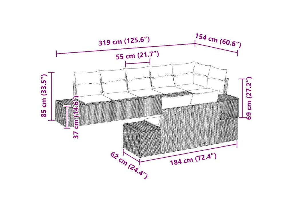 - Materiály: Pohovkový set je z odolného poly ratanu, co snáší UV záření a vlhkost. Kombinace s pevným práškově lakovaným ocelovým rámem zajišťuje stabilitu a dlouhou životnost, což ho dělá ideálním pro venkovní sezení.