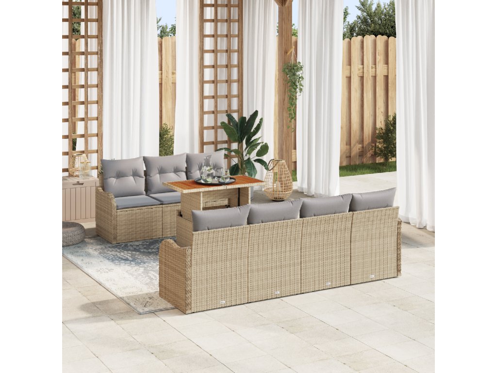 Materiály: Tato sada kombinuje poly ratan, práškově lakovanou ocel a masivní akáciové dřevo, což tvoří odolný a stylový nábytek. Poly ratan přidává rustikální nádech a je odolný vůči UV záření, což je perfektní do venkovních prostor. Práškově lakovaná ocel zajišťuje pevnost a odolnost proti korozi, zatímco akáciové dřevo přidává krásné teplé tóny. Obsah balení: Získáš čtyři pohovky s opěrkami, každá s úložným prostorem, a tři středové sedačky, které také ukrývají úložný prostor, k tomu robustní zahradní stolek. Úložný prostor v pohovkách je skvělý na uschování polštářů nebo dek, aby tvůj prostor vypadal upraveně. Zahradní stolek nabízí praktické místo pro jídlo nebo zábavu. Funkce / Funkcionalita / Design: Tato sada se soustředí na pohodlí a praktičnost, má voděodolné polštáře, ideální pro venkovní použití. Polštáře se dají snadno sundat na údržbu, aby se venku zachovala hygiena. Moderní design má zakřivené poly ratanové opěrky pro pohodlnou oporu a estetický prvek. Celkově je to skvělá kombinace pohodlí a stylu, která se hodí do různých venkovních témat. Doporučené využití: Tato flexibilní sada je ideální pro útulné zahradní kouty nebo velké terasy, které oživí společenské akce nebo klidné chvíle. Je perfektní pro pořádání, vytváří skvělou atmosféru pro intimní rozhovory, rodinné večeře nebo osamělé čtení v příjemném prostředí. Péče a údržba: Aby vypadala skvěle, zakrývej ji, když není ideální počasí. Občas ji stačí otřít vlhkým hadříkem, aby se odstranil prach a udržela se v dobrém stavu. Tato jednoduchá údržba zajišťuje, že zůstane atraktivní a praktická i po letech.- Barva: Béžová a světle šedá