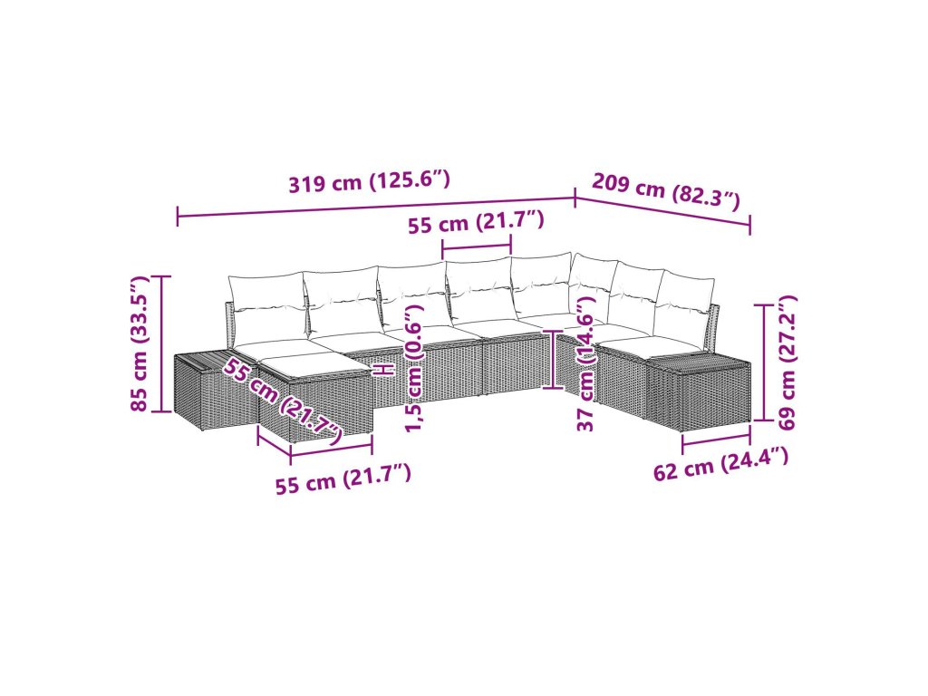 Výstavba z polyratanu Vyrobeno z kvalitního polyratanu, tento pohovkový set je odolný a stylový, zajišťuje pohodlné sezení, které přežije venkovní podmínky. Tkaná struktura dodává elegantní vzhled, ideální pro zahradní dekoraci. Pohodlná nabídka S venkovními polštáři odolnými vůči povětrnostním vlivům slibuje set maximální relaxaci. Zip umožňuje snadné sundání a údržbu, což zajišťuje dlouhá léta čerstvosti. Modulární kontrast Tento modulární design umožňuje přeorganizování podle různých venkovních prostor a vkusu. Tato flexibilita z něj dělá ideální volbu pro různé zahradní potřeby, nebo osvěžení sezónního designu. Funkční opěrky S plochými opěrkami z polyratanu nabízí moderní vzhled a větší pohodlí pro dlouhé chvíle venku. Každá opěrka doplňuje celkový styl a zvyšuje vizuální přitažlivost. Odolný rám Práškově lakovaný ocelový rám poskytuje silnou podporu, která udržuje pohovkový set v kondici při různých povětrnostních podmínkách. Tato pevná struktura zaručuje spolehlivost během klidných odpoledních a setkání s přáteli.- Materiál: Polyratan