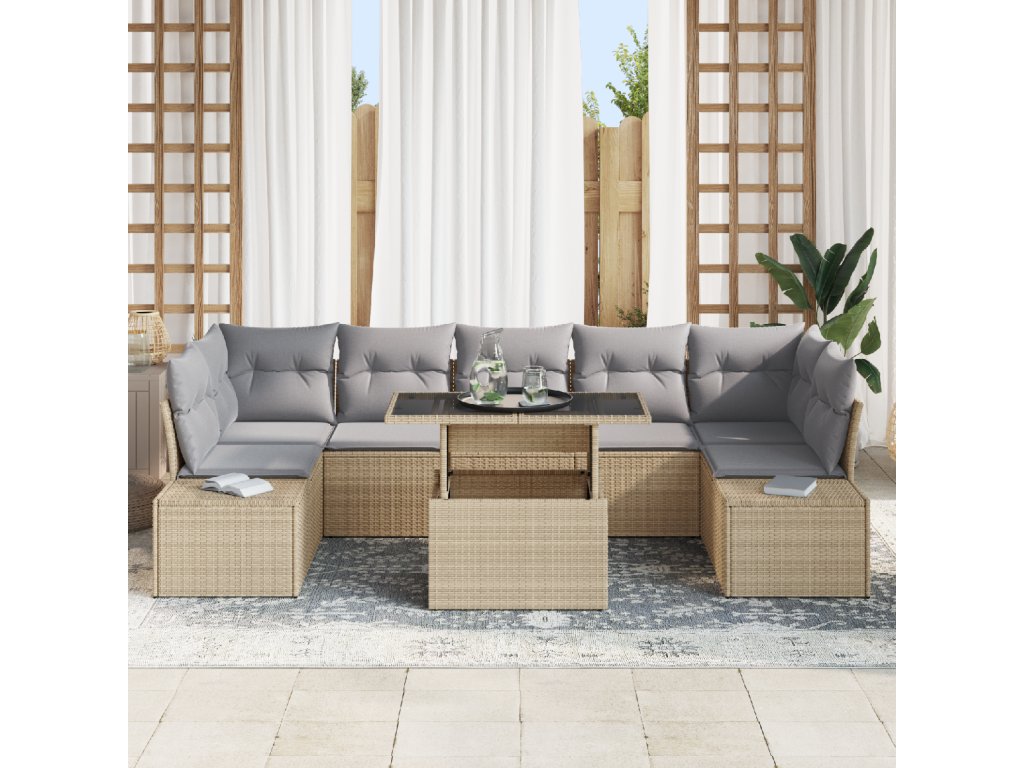Kvalitní materiály: Konstrukce z polyratanu zajišťuje odolnost a běžnou údržbu, takže se hodí do venkovního prostředí. Pevná struktura odolává nepříznivému počasí, čímž si zachovává svoji krásu. Funkční komponenty: Rám z práškované oceli a stůl z tvrzeného skla. Sedací polštáře jsou vyplněny polyesterovými vlákny a mají odnímatelný kryt na zip pro pohodlí. Inovativní funkce: Výškově nastavitelný stůl se jednoduše přemění z kávového na jídelní stůl pomocí jednoduchého ručního ovládání. Lehká konstrukce usnadňuje přesouvání po zahradě nebo terase. Univerzální použití: Ideální pro zahrady a terasy, souprava pohovek se přizpůsobí všem formálním i neformálním akcím. Její přestavitelné sekce umožňují vytvoření uspořádání podle potřeby. Jednoduchá údržba: Použijte ochranný kryt, když se nepoužívá, aby se udržela v dobrém stavu. Povrchy se dají snadno otřít, což zajišťuje jednoduchou údržbu.- Barva: Béžová a světle šedá