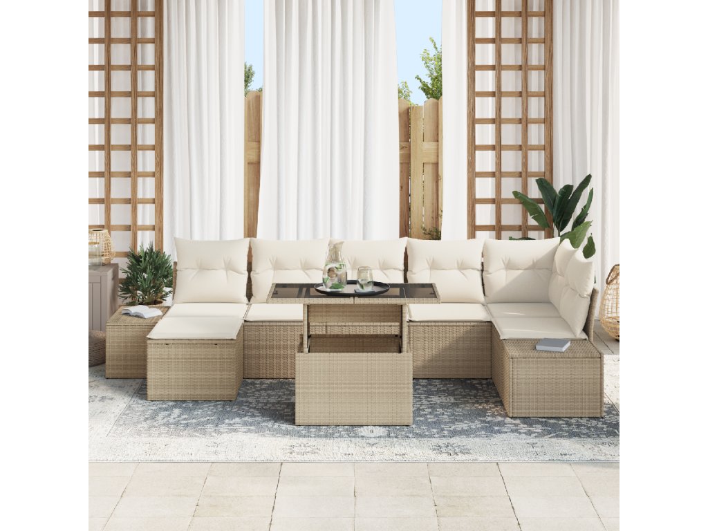 Materiály: Sofa set je z odolného polyratanu, co zaručuje, že to zvládne venkovní podmínky. Tenhle materiál vydrží počasí, hlavně na jaře a v létě, takže je praktický i estetičtější. Polyratan je odolný proti oděru, což prodlužuje životnost a drží vzhled nábytku. Součásti: Set obsahuje rám z polyratanu, opěradlo a temperované sklo na stolu – to všechno přidává na vzhledu a pevnosti. Taky má pohodlné polštáře s polyesterovým výplní pro dlouhý komfort. Vlastnosti / Funkce / Design: Hlavní věc, co umí, je nastavitelná deska stolu, co se lehce změní z jídelního na kávový stůl. To ti umožní si to přizpůsobit, ať už chceš jíst s rodinou nebo mít koktejlovou sešlost. Tento modulární set se integruje do tvojeho venkovního prostoru bez problémů. Doporučené použití: Tenhle set je ideální do zahrad a na terasy, tak si můžeš užívat sezónní příležitosti. Vypadá dobře na neformální i formální akce, takže je univerzální pro různý příležitosti. Údržba: Péče o set je jednoduchá. Doporučuje se na něj používat kryty, když ho zrovna nepoužíváš, aby se to zachovalo v nejlepší kondici. To chrání textury a barvy polyratanu, a díky tomu ti set dlouho vydrží.- Barva: Béžová a krémová