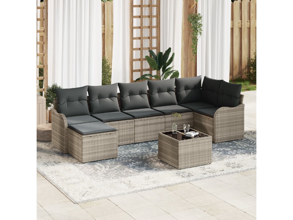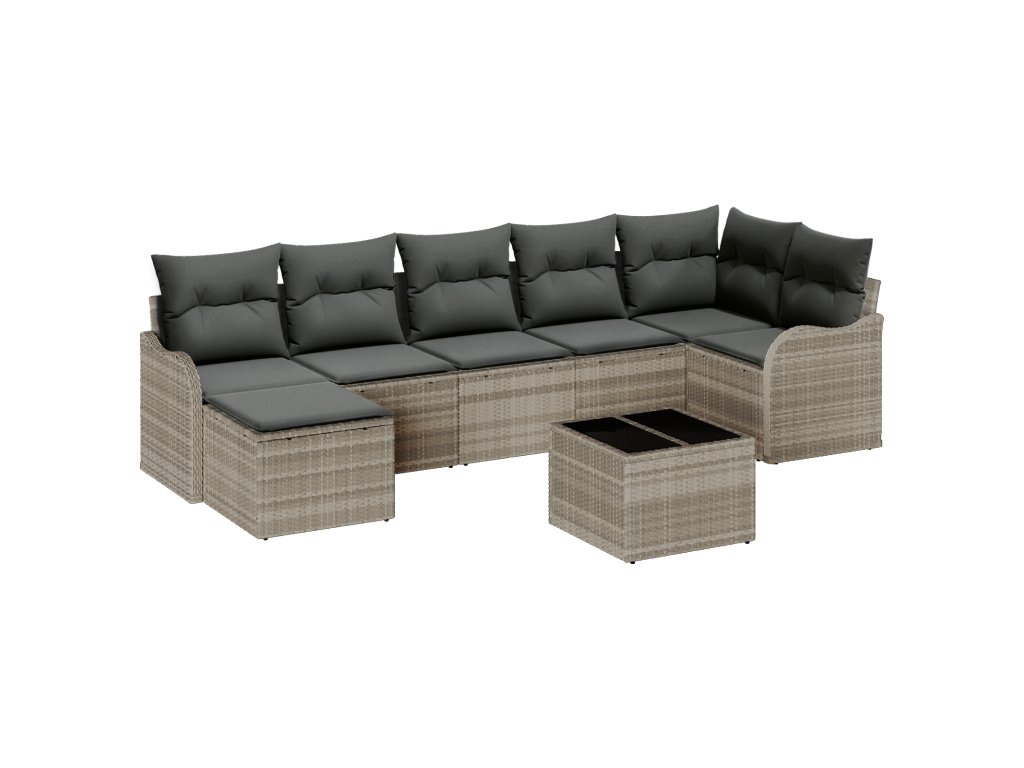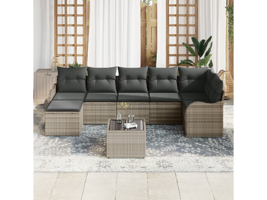 Materiály: Vyrobeno z polyratanu, odolného proti počasí, set slibuje dlouhou životnost. Má pohodlné polyesterové polštáře. Součásti: Obsahuje opěrku a zakřivené opěrky rukou pro oporu a pohodlné sezení. Nožky z práškově lakované oceli dodávají stabilitu. Vlastnosti / Funkce / Design: Navrženo pro venkovní použití, má UV-odolné materiály, které chrání před slunečním poškozením. Modularita umožňuje přizpůsobení různým potřebám. Doporučené použití: Ideální pro zahrady a terasy, tento pohovkový set doplňuje útulné i prostorné akce. Je to osvědčené řešení pro každou společenskou událost. Údržba a péče: Udržujte ho čistý hadříkem. Doporučuje se chránit před špatným počasím. Odnímatelné potahy se snadno čistí a udržují minimální úsilí pro údržbu.- Barva: Světle šedá