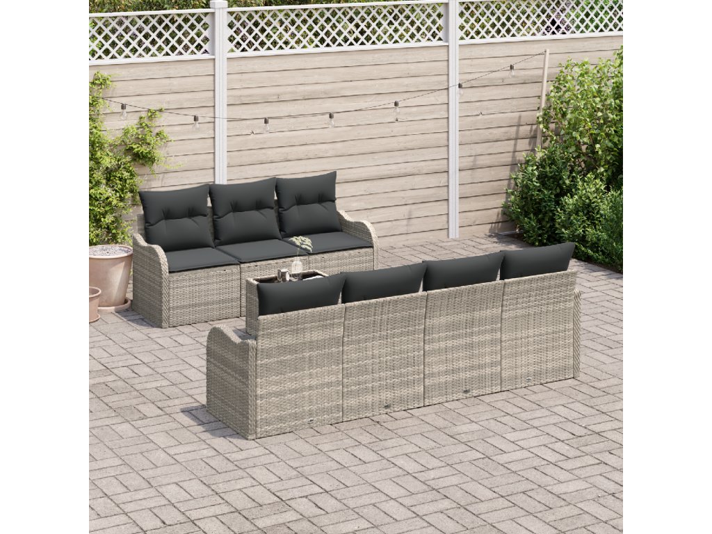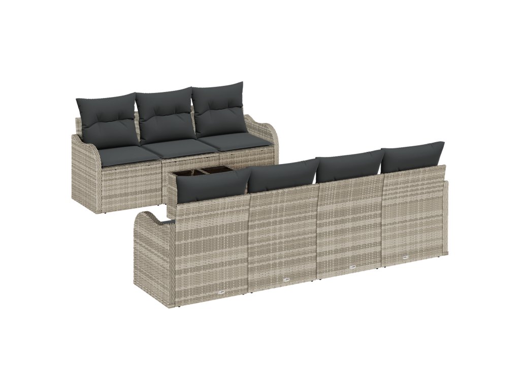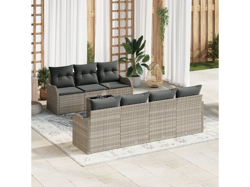 Materiál poly ratan: Moderní zahradní sofa set je vyroben z kvalitního poly ratanu, který je trvanlivý a lehký. Tento materiál vydrží UV záření, takže tvůj nábytek si zachová vzhled sezónu po sezóně bez vyblednutí nebo poškození. Navíc textura poly ratanu dodává eleganci a sofistikovanost tvému venkovnímu prostoru, takže se stává stylovým středobodem. Kompletní set: Tento set obsahuje tři centrální židle, čtyři pohovky s opěrkami a odpovídající obdélníkový stůl, všechno navrženo s ohledem na uživatelský komfort. Komponenty, jako poly ratanové opěrky a skleněná deska stolu, spolu skvěle ladí, aby nabídly maximální pohodlí, styl a funkčnost pro společenské akce nebo klidné chvíle. Flexibilní design: Modulární uspořádání umožňuje majitelům snadno měnit rozmístění sezení tak, aby vyhovovalo jejich potřebám, ať už jde o intimní rozhovory nebo větší oslavy. Pratelné potahy přidávají praktičnost, takže tvůj nábytek zůstane svěží a příjemný i po delší době používání. Všestranné použití: Ideální pro zahrady, terasy a dvorky, tenhle sofa set se bez problémů přizpůsobí různým venkovním prostorům. Je navržen tak, aby vyhovoval různorodým životním stylům, od neformálních rodinných večeří po živé zahradní párty, a vytvoří atmosféru, která podporuje relaxaci a pohodu. Snadná údržba: Údržba tohohle nábytkového setu je snadná, potahy se dají snadno sundat a prát. Pravidelně utírej povrchy navlhčeným hadříkem, aby zůstaly v top stavu, a používej kryty, když je nepoužíváš, abys je chránil před nepřízní počasí.- Barva: Světle šedá