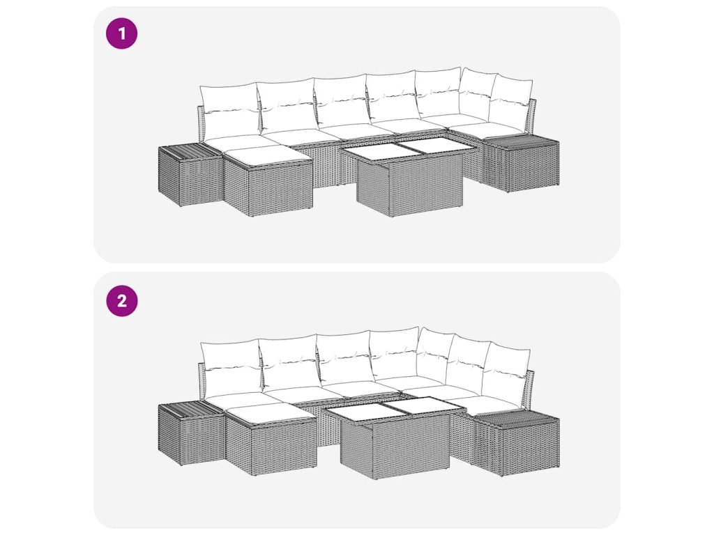 - Funkční komponenty: Souprava zahrnuje různé možnosti sezení - boční sofa, rohové a centrální sedačky - plus praktický taburet a zahradní stůl. Každá část zvyšuje pohodlí a přizpůsobitelnost pro uživatele.