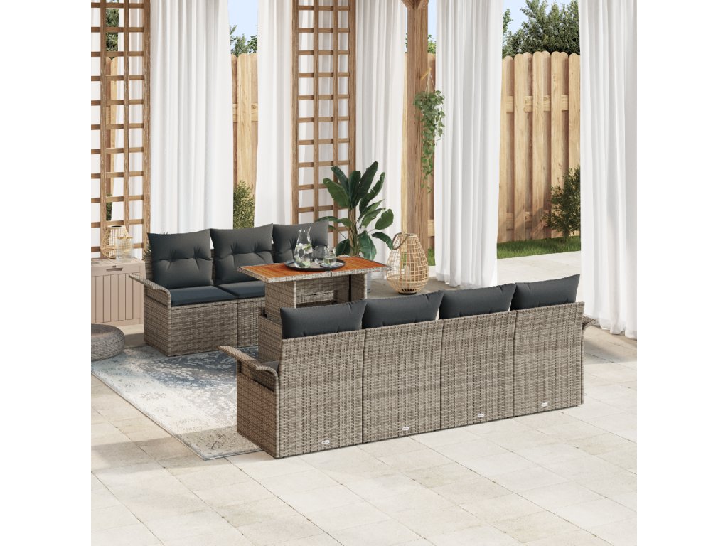 Prémiové materiály: Vyrobeno z polyratanu, práškově lakované oceli a masivního akáciového dřeva, každý materiál je vybrán pro svou odolnost a vizuální přitažlivost. Polyratan nabízí stylovou, texturovanou povrchovou úpravu, zatímco práškově lakovaná ocel poskytuje robustní rám. Stůl z akáciového dřeva dodává dotek přirozeného vkusu, díky čemuž je set jak pevný, tak elegantní. Zahrnuté komponenty: Tento komplexní set obsahuje čtyři pohovky s područkami a úložným prostorem, tři středové sedadla také s úložným prostorem a jeden zahradní stůl. Každá komponenta je navržena tak, aby zvyšovala použitelnost a komfort, což vám umožňuje přizpůsobit a uspořádat váš prostor podle potřeby. Funkce a použitelnost: Vyrobeno z UV-odolných materiálů, tento set odolává prodloužené expozici slunečnímu světlu, aniž by se degradovalo. Polštáře jsou odnímatelné a vyměnitelné, navrženy tak, aby odolávaly počasí bez ztráty komfortu nebo stylu. Flexibilita tohoto setu podporuje různé konfigurace, ať už na intimní setkání nebo větší hostování. Doporučené prostředí: Ideální pro zahradní nebo terasové prostředí, tento pohovkový set se bezproblémově hodí do venkovních prostor, transformující je na příjemná místa pro relaxaci a socializaci. Různé uspořádání činí ideální pro vytváření jak skrytých koutů, tak prostorných odpočinkových zón. Údržba a péče: Používejte ochranný kryt, když není v použití, abyste zachovali set proti živlům. Otírejte vlhkým hadříkem pro běžné čištění. Tyto jednoduché praktiky pomáhají udržovat set v prvotřídním stavu a zajišťují jeho dlouhověkost.- Barva: Šedá