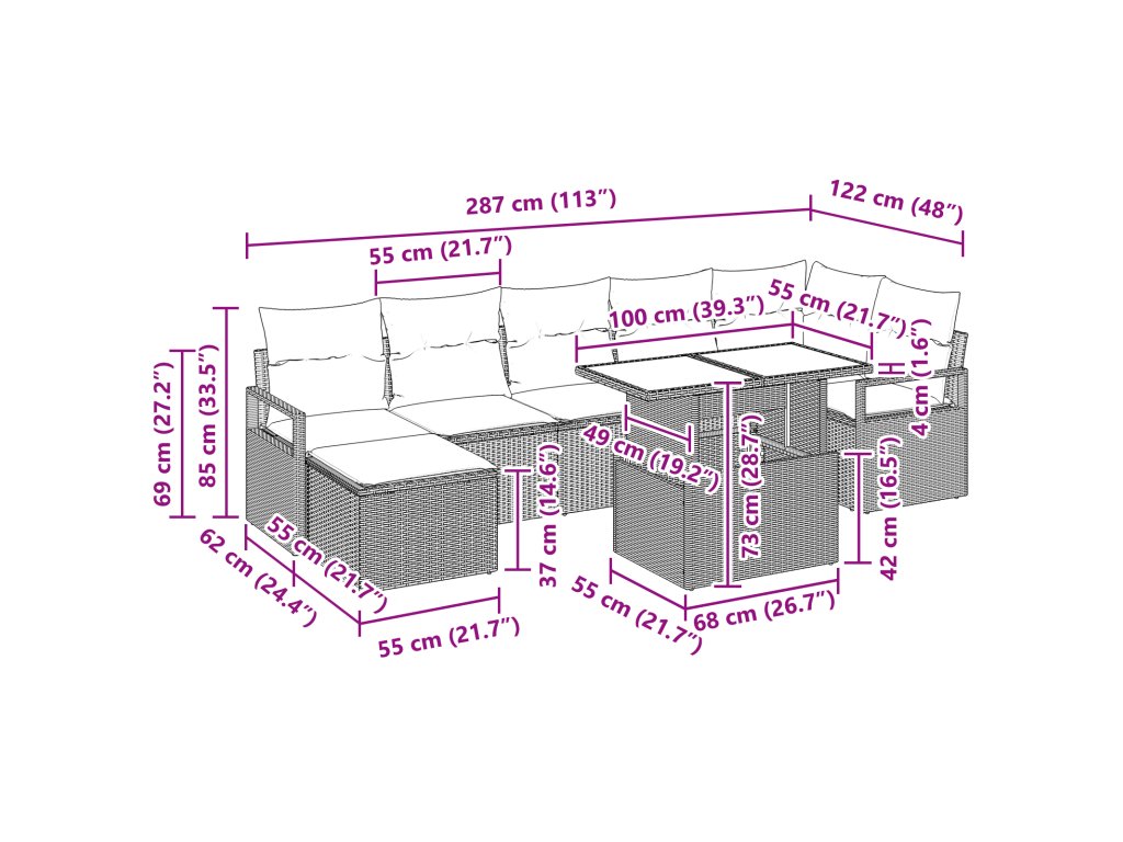 Odolné materiály Set je vyroben z kvalitního poly ratanu, který odolává UV záření a nepříznivému počasí. Práškově lakovaný ocelový rám zajišťuje stabilitu a dlouhou životnost. Tento materiál se postará o to, aby set vypadal stále jako nový. Součásti v balení Set obsahuje rohovou část, tři středová sedadla, dva taburety a stůl, což vše dohromady skvěle funguje. Součástí jsou také měkké polštáře, které zaručují pohodlí. Vše bylo pečlivě navrženo, aby ladilo s moderním stylem exteriéru. Funkčnost a design Modulární design vám dovolí snadno měnit uspořádání sedadel, což je skvělé na různé příležitosti. Dobře promyšlené úložné prostory vám pomohou udržet pořádek na vaší terase nebo v zahradě. Tato přizpůsobivost je ideální pro společenské akce. Univerzálnost aplikace Set skvěle zapadne do zahrad, teras nebo moderních městských balkonů. Hodí se jak na neformální setkání, tak k odpočinku, takže je všestranný pro různé venkovní prostředí. Snadná údržba Údržba je jednoduchá: stačí používat ochranné kryty a polštáře, když je nepoužíváte, uchováte tak set v dobrém stavu s minimálním úsilím.- Barva: Černá a krémová