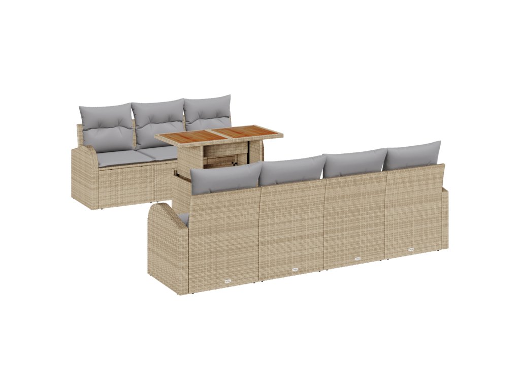 Materiály: Vyrobeno z poly ratanu a práškově lakované oceli, tento zahradní set myslí na odolnost i styl. Poly ratan zajišťuje, že zvládne různé počasí a vypadá přitom skvěle. Ocelový rám dodává pevnost, takže je to skvělý doplněk pro vaši zahradu nebo terasu. Akátové povrchy dodávají nádech přírodní elegance. Součásti: Set obsahuje čtyři pohovky na rukou, tři středové sedačky (všechny s vestavěným úložným prostorem) a zahradní stůl, takže máte pokryté všechny potřeby venkovního sezení. Každý kus je pečlivě vyrobený pro praktické používání, a úložný prostor je super užitečný pro venkovní život. Funkce / Použití / Design: UV odolné materiály zajišťují, že set vypadá skvěle a odolává vyblednutí od slunce. Odnímatelné polštáře se snadno udržují, takže je můžete jednoduše vyčistit nebo vyměnit. Doporučené použití: Tento zahradní set je ideální pro venkovní prostory a skvěle funguje jak v útulných, tak prostorných zahradách. Ať už si užíváte snídaně nebo večerní party, vypadá dobře na každém venkovním místě a poskytuje pohodlné sezení. Údržba: Aby set zůstal v top stavu, zakryjte ho, když se nepoužívá, a občas ho otřete vlhkým hadříkem. Trochu péče zajistí, že s vámi vydrží a nabídne skvělé zážitky každé jaro a léto.- Barva: Béžová a světle šedá
