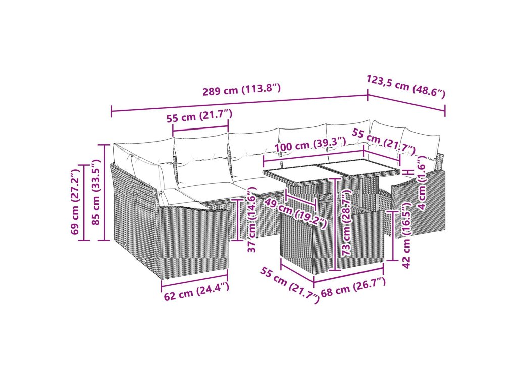 - 2 x Rohové sedadlo: 62 x 62 x 69 cm (ŠxHxV)