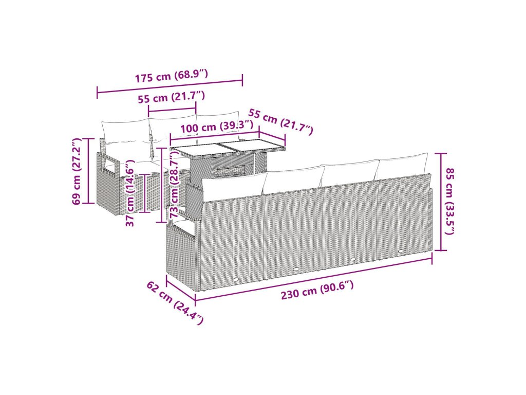 - 4 x Boční gauč: 60 x 62 x 69 cm (D x Š x V)