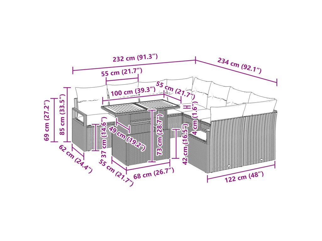 Tato sada zahradního stolování z poly ratanu dokonale spojuje moderní styl s praktičností a nabízí všestrannou možnost venkovního nábytku pro jakoukoli zahradu nebo terasu. Její elegantní, minimalistický design, charakterizovaný čistými liniemi a pevnými akáciovými dřevěnými povrchy, je funkční i vizuálně atraktivní. Modulární konfigurace soupravy ti umožní přizpůsobit tvůj prostor, což ji činí ideální pro rodinné oslavy i samostatné lenošení. Její odolné materiály zajišťují dlouhou životnost, zatímco pohodlné polštáře dodávají dotek luxusu tvému venkovnímu prostředí.
