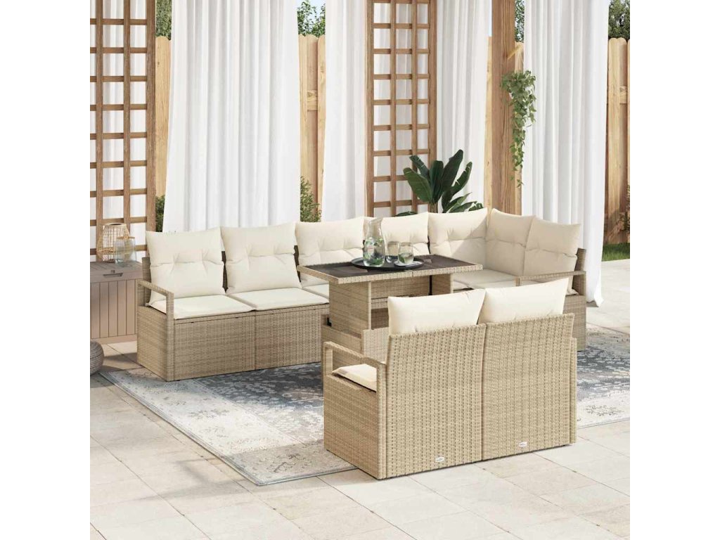 Materiály poly ratan a polyester Zahradní pohovková sada je vyrobená z kvalitního poly ratanu, který je odolný a chrání před počasím, takže vydrží dlouho. Polyesterová látka doplňuje vzhled a dává pohodlí, navíc je snadná na údržbu. Kompletní součásti Sada obsahuje rohovou sedačku (62x62x85 cm), tři středové sedačky (55x62x85 cm každá), čtyři křesla (55x62x85 cm každé) a univerzální stůl (100x55x73 cm), takže je dost místa na sezení pro různé venkovní příležitosti. Funkční nastavitelný stůl Stůl má nastavitelné nohy, takže ho můžete mít jako stůl na kávu nebo na jídlo, a skvěle se hodí pro různé potřeby, od snídaně venku až po večeře s přáteli. Univerzální použití Sada je skvělá na zahrady, terasy nebo jiné venkovní prostory a snadno se přizpůsobí různým ročním obdobím. UV-odolný design odolává slunečnímu záření, aniž by vybledl a je snadný na údržbu. Péče a údržba Sada pohovek potřebuje minimální údržbu díky své robustní konstrukci. Pro dlouhou životnost používejte ochranný kryt, když nábytek není používán, aby zůstal v dobrém stavu při každém ročním období.- Barva: Béžová