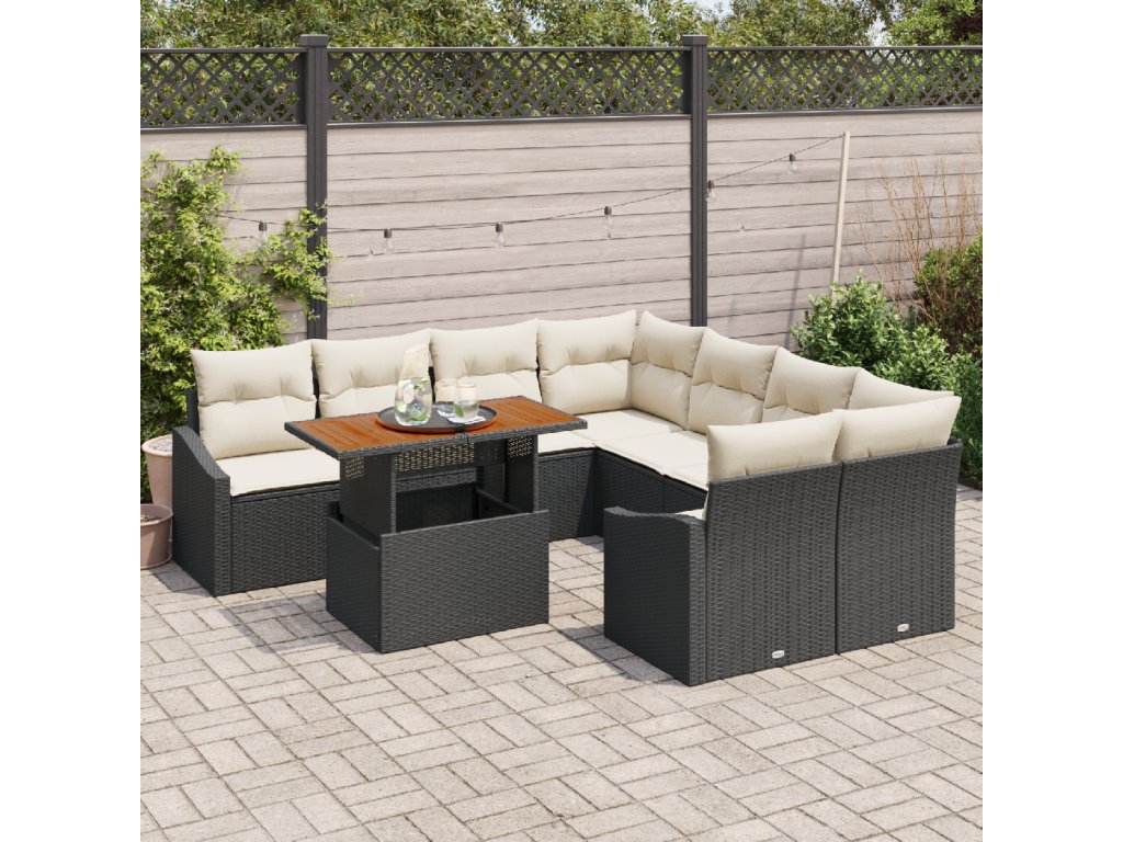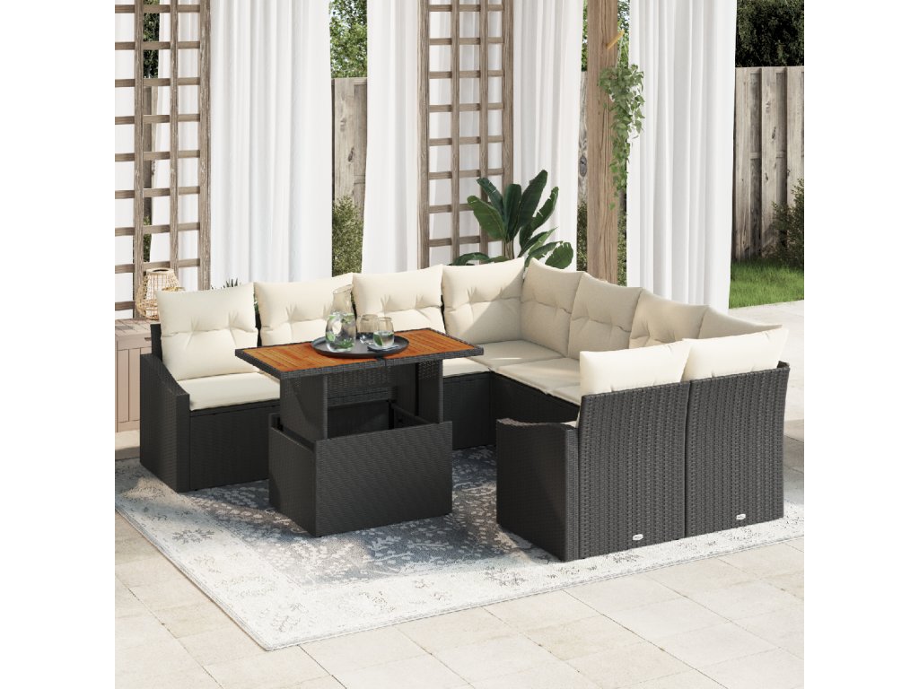 Prémiové materiály: Vyrobeno z odolné oceli s práškovým lakováním, poly ratanu a masivního akáciového dřeva, tato jídelní sada zajišťuje trvanlivost a odolnost vůči UV záření a počasí. Vysoce kvalitní materiály nabízejí harmonickou kombinaci síly a elegance, což ji činí ideální pro venkovní použití. Úložná funkčnost: Pečlivě navrženo s integrovanými úložnými prostory v područkách, rohových a středových sedadlech, nabízí praktické řešení pro organizaci polštářů a dalších nezbytností. Tato funkce přidává pohodlí, což činí ideální pro uklizené venkovní prostory. Modulární variabilita: Modulární prvky jídelní sady umožňují různá uspořádání. Snadno upravte rozložení podle potřeb, ať už jde o útulnou večeři nebo velké setkání, zajišťující flexibilitu a zlepšující zážitek. Čtvercové opěrky rukou: S geometrickými, rovnými rameny vyrobenými z poly ratanu, poskytující praktickou podporu a estetickou hodnotu. Tento promyšlený design přispívá k celkovému pohodlí a stylu, vyzývá k relaxaci a interakci. Péče o výrobek: Chraňte svou sadu voděodolným krytem a otírejte povrchy akáciového dřeva vlhkým hadříkem, abyste udrželi jejich krásu. Dodržováním těchto jednoduchých kroků zůstane vaše jídelní sada zářivá a připravená k použití.- Barva: Černá a krémová