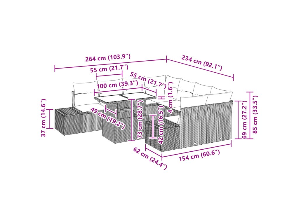 Prémiové materiály: Vyrobeno z kvalitního poly ratanu, tenhle set je odolný a trvanlivý. Poly ratan má moderní vzhled a vydrží i špatné počasí. Práškově lakovaný ocelový rám dodává pevnost a dlouhou životnost. Kompletní součásti: Modulární uspořádání zahrnuje dvě boční pohovky, dvě rohové sedačky, čtyři střední sedačky a jeden stůl. Každý prvek je pohodlně polstrovaný a spojuje funkčnost s elegancí. Funkčnost a design: Stůl s nastavitelnou výškou snadno přetvoříte z jídelního na kávový, takže se hodí pro každou příležitost. Moderní styl s čistými liniemi se hodí kamkoliv. Ideální venkovní použití: Designovaný pro pohodlí, tenhle set se hodí na zahrady, terasy nebo do patio. Bez problémů zapadne do vašeho letního životního stylu a poskytne pohodlí pro setkání s lidmi. Jednoduchá údržba: Udržet set v top stavu je snadné; použijte potah, když se nepoužívá, aby vydržel déle. Minimální péče udržuje vzhled svěží, aby jste si mohli užívat náš krásný venkovní ráj.- Barva: Béžová a krémová