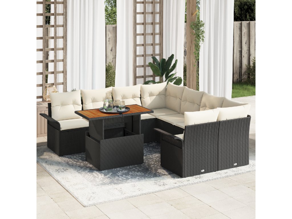 Tkaná textura: Užijte si eleganci a kouzlo tkaného polyratanu, který dodává charakter každému venkovnímu prostředí. Důmyslný tkaný vzor nejen zvyšuje vizuální přitažlivost, ale také přispívá k pohodlí a relaxaci nabízené touto zahradní sedací soupravou., Odolné komponenty proti počasí: Navrženo pro dlouhověkost venku, tato sada je vyrobena z UV-odolného polyratanu a práškově lakované oceli, což zajišťuje, že odolává tvrdému slunečnímu záření a různým povětrnostním podmínkám a přináší klid na duši pro dlouhodobé používání., Funkční design: S odnímatelnými a vyměnitelnými polštáři tato sada nabízí praktickou funkčnost. Společně s integrovanými možnostmi skladování v každém kusu zajišťuje, že budete udržovat uklizený a organizovaný venkovní prostor., Aestetická univerzálnost: Její moderní design s zakřivenými opěrkami rukou a povrchem z hnědé akácie se pohodlně snoubí s různými styly. Ať už v zahradě nebo na terase, povyšuje prostředí prostřednictvím svých přizpůsobivých vzhledů., Péče a údržba: Mějte klid, protože péče je jednoduchá. Otřete vlhkým hadříkem nebo použijte obal, když není používán, abyste zachovali jeho stav, zajišťující, že váš nábytek vždy vypadá jako nový. Pohodlné pokyny pro péči činí údržbu snadnou i pro zaneprázdněný životní styl.- Barva: Černá a krémová