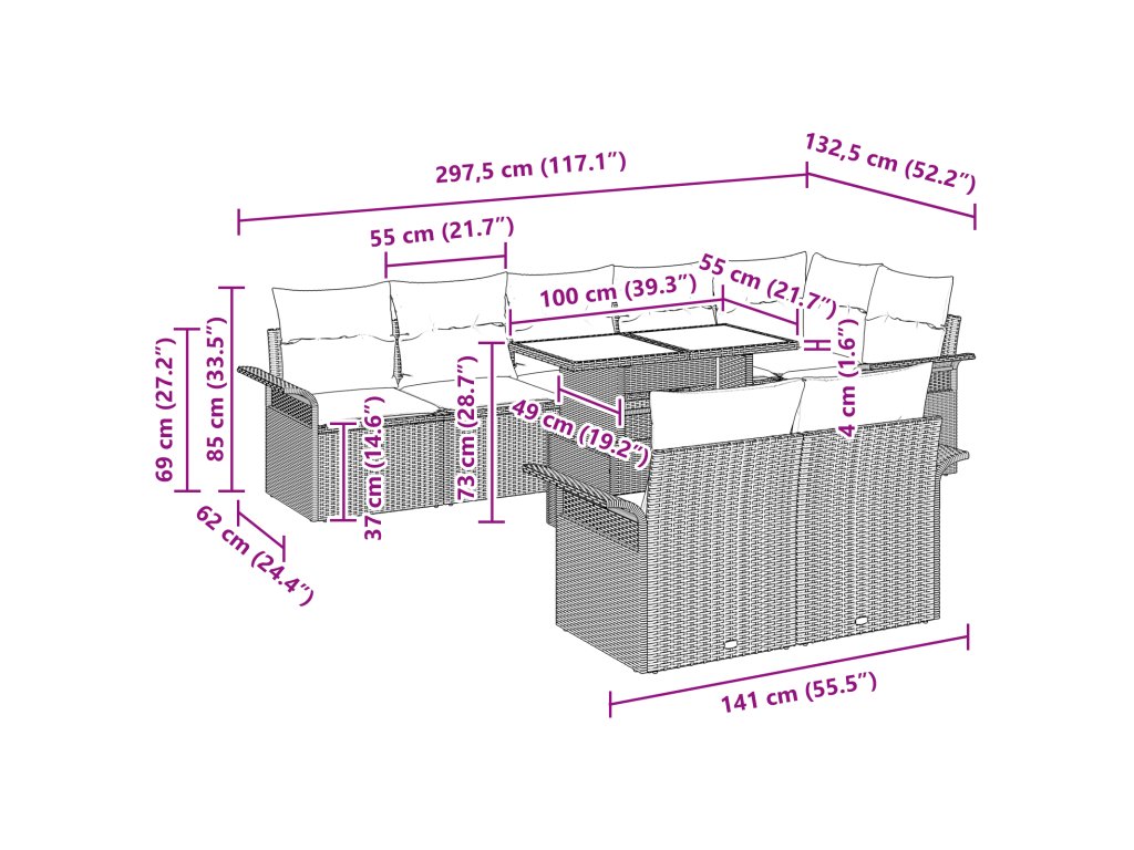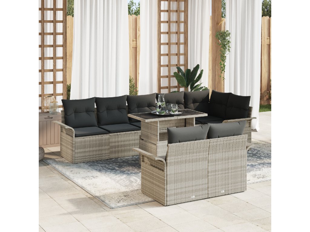 Odolné materiály Tato nábytková sada je vyrobená z kvalitního polyratanu a odolává blednutí, skvrnám, UV záření a vlhkosti. Robustní materiály zaručují dlouhou životnost, takže je to skvělá volba pro venkovní prostory. Součásti sady Tato komplexní sada zahrnuje rohové sedadlo, tři střední sedadla, čtyři křesla a stůl, všechny s pěkným provedením zadní strany. Navíc přicházejí s venkovními polštáři z odolné látky, která zajišťuje pohodlí a trvanlivost. Funkční prvky Povrch stolu z tvrzeného skla a ostatní díly jsou opatřeny práškovým lakem pro delší životnost. Manuální mechanismus umožňuje jednoduše přepnout výšku stolu z kávového na jídelní, což dodává flexibilitu. Doporučené použití Perfektní pro zahradu a terasu, přemění tyto prostory na útulné útočiště. Modulární design sady umožňuje různá uspořádání, a snadno se přizpůsobí vašim potřebám pro relaxaci nebo zábavu. Údržba Používejte kryt, když se nepoužívá, abyste prodloužili životnost. Údržba je jednoduchá a vyžaduje minimální úsilí, aby váš nábytek vypadal svěže a živě po celou sezónu.- Barva: Světle šedá