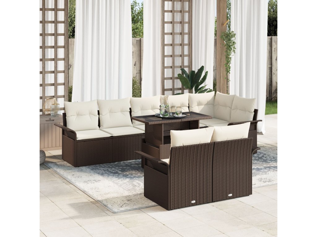 Odolné materiály Tato nábytková sada je vyrobená z kvalitního polyratanu a odolává blednutí, skvrnám, UV záření a vlhkosti. Robustní materiály zaručují dlouhou životnost, takže je to skvělá volba pro venkovní prostory. Součásti sady Tato komplexní sada zahrnuje rohové sedadlo, tři střední sedadla, čtyři křesla a stůl, všechny s pěkným provedením zadní strany. Navíc přicházejí s venkovními polštáři z odolné látky, která zajišťuje pohodlí a trvanlivost. Funkční prvky Povrch stolu z tvrzeného skla a ostatní díly jsou opatřeny práškovým lakem pro delší životnost. Manuální mechanismus umožňuje jednoduše přepnout výšku stolu z kávového na jídelní, což dodává flexibilitu. Doporučené použití Perfektní pro zahradu a terasu, přemění tyto prostory na útulné útočiště. Modulární design sady umožňuje různá uspořádání, a snadno se přizpůsobí vašim potřebám pro relaxaci nebo zábavu. Údržba Používejte kryt, když se nepoužívá, abyste prodloužili životnost. Údržba je jednoduchá a vyžaduje minimální úsilí, aby váš nábytek vypadal svěže a živě po celou sezónu.- Barva: Hnědá