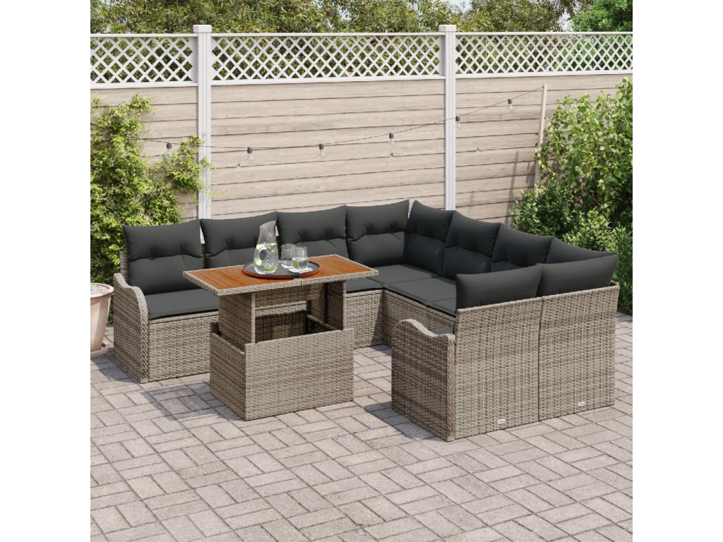 Materiály: Tenhle zahradní sofa set je z polyratanu, což je známý materiál, který vydrží venkovní podmínky. Rám z práškově lakované oceli je pevný a stabilní. Desky z masivního akáciového dřeva dotvářejí přirozený a elegantní vzhled, což zaručuje roky stylu a užívání. Kombinace těchto materiálů znamená, že set je dost silný i při změnách počasí, a je skvělou volbou pro milovníky venkovního bydlení. Součásti: Set obsahuje dva dvojsedáky, čtyři středové sedačky a zahradní stůl, což vám dá spoustu variant pro pohodlné uspořádání. Každé sofa má pohodlné a odolné polštáře pro venkovní použití. Zakřivené opěrky rukou a tvar zadní části sofa se postarají o pohodlí a styl. Vlastnosti / Funkce / Design: Design má materiály, které odolávají UV záření, takže si uchovávají svůj vzhled i při silném slunečním svitu. Odnímatelné polštáře usnadňují údržbu, takže je jednoduché je vyčistit nebo vyměnit. Kromě toho zakřivené opěrky rukou a pohodlné materiály dodávají příjemný pocit. Doporučené použití: Perfektní pro venkovní použití v zahradách, na terasách nebo slunných dvorech; tenhle set je ideální na jarní a letní akce. Je dost flexibilní, aby se přizpůsobil různým uspořádáním, takže ho snadno můžete upravit z uvolněného místa pro rodinu na elegantní zábavní prostor. Péče a údržba: Pro údržbu je nejlepší použít ochranný kryt, když se set nepoužívá. Pravidelně otírejte vlhkým hadříkem, aby set vypadal skvěle, a to i při různých povětrnostních podmínkách.- Barva: Šedá
