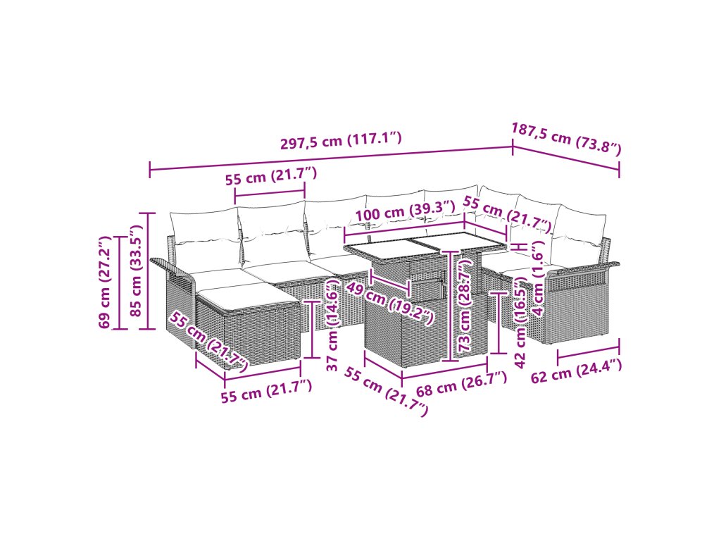 Kvalitní materiály: Vyrobeno z poly ratanového materiálu, tento set spojuje odolnost a elegantní vzhled, čímž oživuje váš venkovní prostor. Poly ratan vydrží blednutí a UV záření, skvěle se hodí na slunce. Polyesterové polštáře přidávají pohodlný a stylový vzhled, který vydrží. Modulární layout: Set má různé části, jako jsou rohové a středové sedáky a pohovky, které se dají uspořádat jak potřebujete. Tato modulární struktura vám dá svobodu přizpůsobit si prostor pro různé akce, ať už menší nebo větší. Konvertibilní design stolu: Obsahuje nastavitelný stůl, který se dá lehce použít buď na kávu, nebo jako jídelní stůl. Tvrzené sklo dodává styl, přičemž zaručuje funkčnost. Všestranný pro jídla i neformální setkání. Ochranná konstrukce: Rám z práškově lakované oceli a odolné polštáře dlouho vydrží venku, aniž by ztratily styl nebo pohodlí. Díky tomu je tento set spolehlivý za jakýchkoliv povětrnostních podmínek. Snadná údržba: Navržené pro jednoduchou údržbu, doporučuje se set zakrývat, když se nepoužívá. Práškově lakovaný povrch se snadno čistí suchým hadříkem, takže údržba je jednoduchá a rychlá.- Barva: Světle šedá