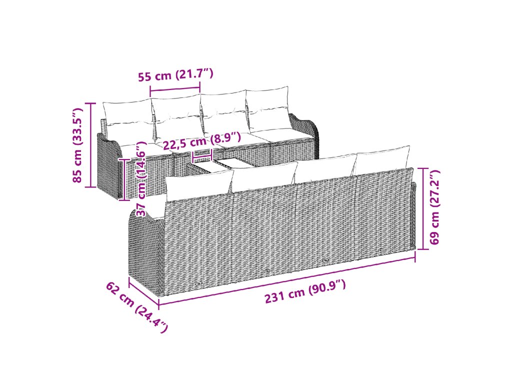 Tato současná zahradní sedací souprava je stylová a pohodlná pro venkovní prostory. Kombinuje moderní design s praktičností, což ji dělá ideální pro zahrady nebo terasy. Obdélníkový tvar je univerzální, snadno se přizpůsobí jak intimním šichtám, tak větším akcím.