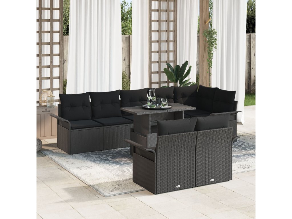 Odolné materiály Tato nábytková sada je vyrobená z kvalitního polyratanu a odolává blednutí, skvrnám, UV záření a vlhkosti. Robustní materiály zaručují dlouhou životnost, takže je to skvělá volba pro venkovní prostory. Součásti sady Tato komplexní sada zahrnuje rohové sedadlo, tři střední sedadla, čtyři křesla a stůl, všechny s pěkným provedením zadní strany. Navíc přicházejí s venkovními polštáři z odolné látky, která zajišťuje pohodlí a trvanlivost. Funkční prvky Povrch stolu z tvrzeného skla a ostatní díly jsou opatřeny práškovým lakem pro delší životnost. Manuální mechanismus umožňuje jednoduše přepnout výšku stolu z kávového na jídelní, což dodává flexibilitu. Doporučené použití Perfektní pro zahradu a terasu, přemění tyto prostory na útulné útočiště. Modulární design sady umožňuje různá uspořádání, a snadno se přizpůsobí vašim potřebám pro relaxaci nebo zábavu. Údržba Používejte kryt, když se nepoužívá, abyste prodloužili životnost. Údržba je jednoduchá a vyžaduje minimální úsilí, aby váš nábytek vypadal svěže a živě po celou sezónu.- Barva: Černá