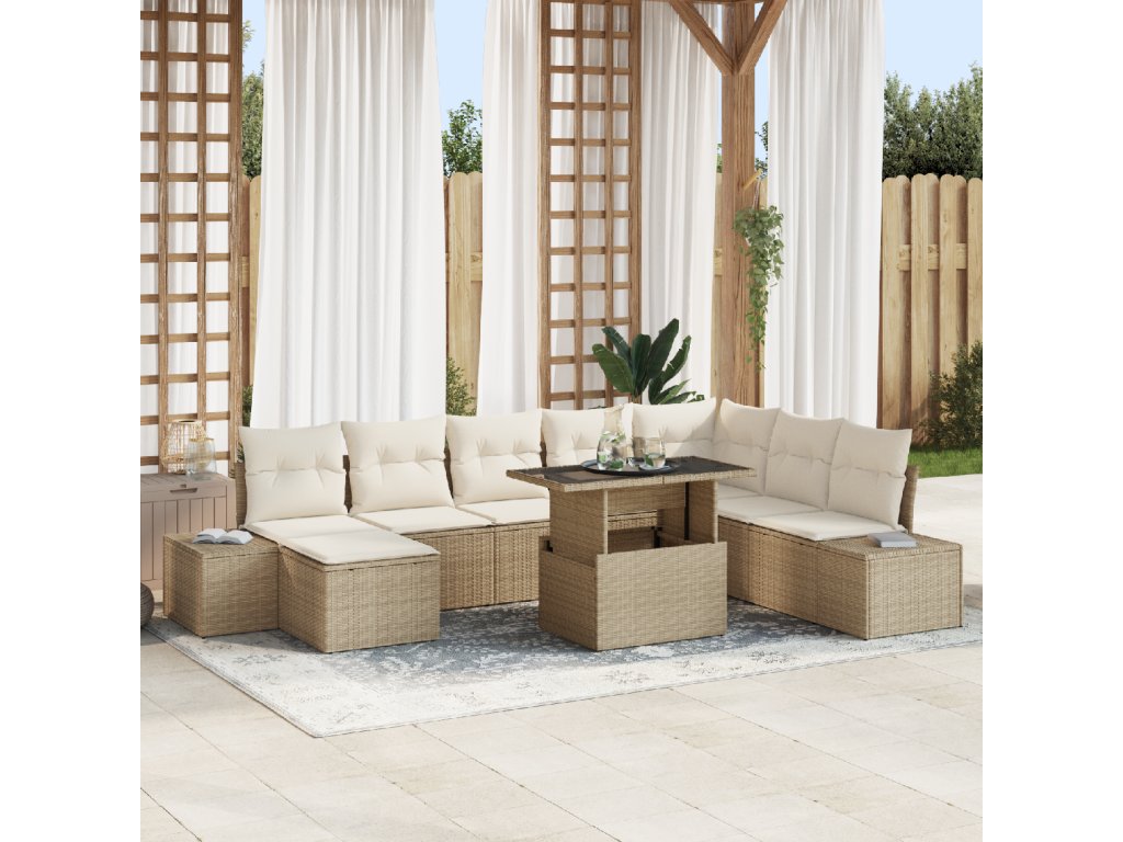 Materiály: Rám je z práškově lakované oceli, což zaručuje odolnost vůči povětrnostním vlivům a stabilní podporu po celý rok. Povrchy s temperovaným sklem přidávají lesk a usnadňují údržbu. Součásti sady: Sada obsahuje dvě postraní sedačky, čtyři centrální sedadla, rohové sedadlo, podnožku a zahradní stůl, takže máte dost místa na sezení. Každý kus je z poly ratanu, což spojuje styl a odolnost. Polštáře plněné polyesterem nabízejí skvělé pohodlí a lehkou údržbu. Funkce / Design: Skvělá vlastnost je trvácí design, který je ideální pro časté používání. Výškově nastavitelný stůl usnadňuje přechod od stolování k pohodovému posezení u kávy, a skvěle se přizpůsobuje různým příležitostem. Užijte si pohodlí a flexibilitu s touto funkcí. Doporučené použití: Perfektní na zahrady a terasy, tahle sada je ideální pro venkovní relaxaci a akce. Její modulární design umožňuje úpravy podle vašeho prostoru a událostí, což se hodí jak na rodinné setkání, tak i na velké oslavy. Údržba: Chcete-li, aby vydržela dlouho, používejte ochranné kryty, když ji nepoužíváte, abyste ji chránili před špatným počasím. Pravidelná údržba stačí s suchým hadrem, což je super jednoduché. Tak snadno udržíte vypadání jako nové sezónu po sezóně.- Barva: Béžová a krémová