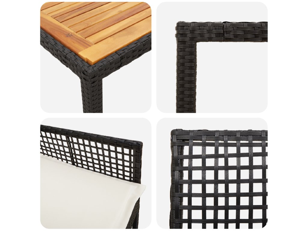 Materiály: Tato zahradní jídelní souprava z polyratanu má hladký povrch, který spojuje moderní styl s trvanlivostí. Polyratan je vybrán pro svou odolnost vůči špatnému počasí, takže si udržuje vzhled a strukturu i v různých ročních obdobích. Tento materiál dodává stylový, moderní dojem, zatímco je flexibilní a zabraňuje prasklinám nebo zlomeninám. Součásti: Jídelní souprava má velký stůl s pevným polyratanovým vrchem, který nabízí dostatek místa pro jídlo i zábavu. Každá židle je navržená tak, aby byla pohodlná, abyste si mohli užívat dlouhé chvíle s rodinou a kamarády. Všechny díly spolu tvoří krásnou kombinaci stylu a praktičnosti pro vaši venkovní jídelní zónu. Vlastnosti / Funkce / Design: Tato souprava je navržena tak, aby odolávala nepřízni počasí. Její voděodolné vlastnosti chrání před deštěm a UV zářením, takže vydrží a poskytne skvělou hodnotu. Stylový design se hodí k různým venkovním stylům – od klasiky po modernu a bez problému oživí jakékoli místo. Doporučené použití: Ideální na venkovní prostory jako terasy, zahrady a verand, tahle jídelní souprava je skvělým centrem pro každodenní jídla i speciální příležitosti. Její příjemný vzhled vás zve k pohodovým jídlům a setkáním, což ji dělá nezbytnou pro jakýkoli venkovní prostor, ať už doma nebo v podnikání. Údržba a péče: Udržet ji v perfektní kondici je jednoduché – stačí ji otřít vlhkým hadříkem a bude jako nová. A aby vydržela suitable for co nejdéle, je fajn ji na extrémní počasí zakrýt. S nízkými nároky na údržbu si uchová svůj půvab bez zbytečného úsilí.- Barva: Černá
