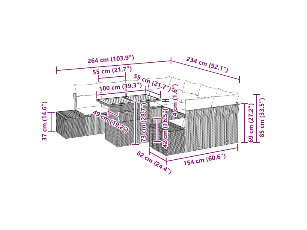 Tento set zahradního jídelního nábytku Poly Rattan představuje současnou eleganci a funkčnost, ideální pro zkrášlení jakékoliv venkovní obytné plochy, ať už zahrady nebo terasy. Elegantní, moderní design kombinuje práškově lakovaný ocelový rám ozdobený poly ratanovými materiály, fúzující stylem s udržitelnou odolností ideální pro pohodové venkovní jídlo a setkání. Jeho lákavý vzhled je doplněn obdélníkovým designem ideálním pro ubytování přátel a rodiny pod jasným sluncem jarních a letních dnů.
