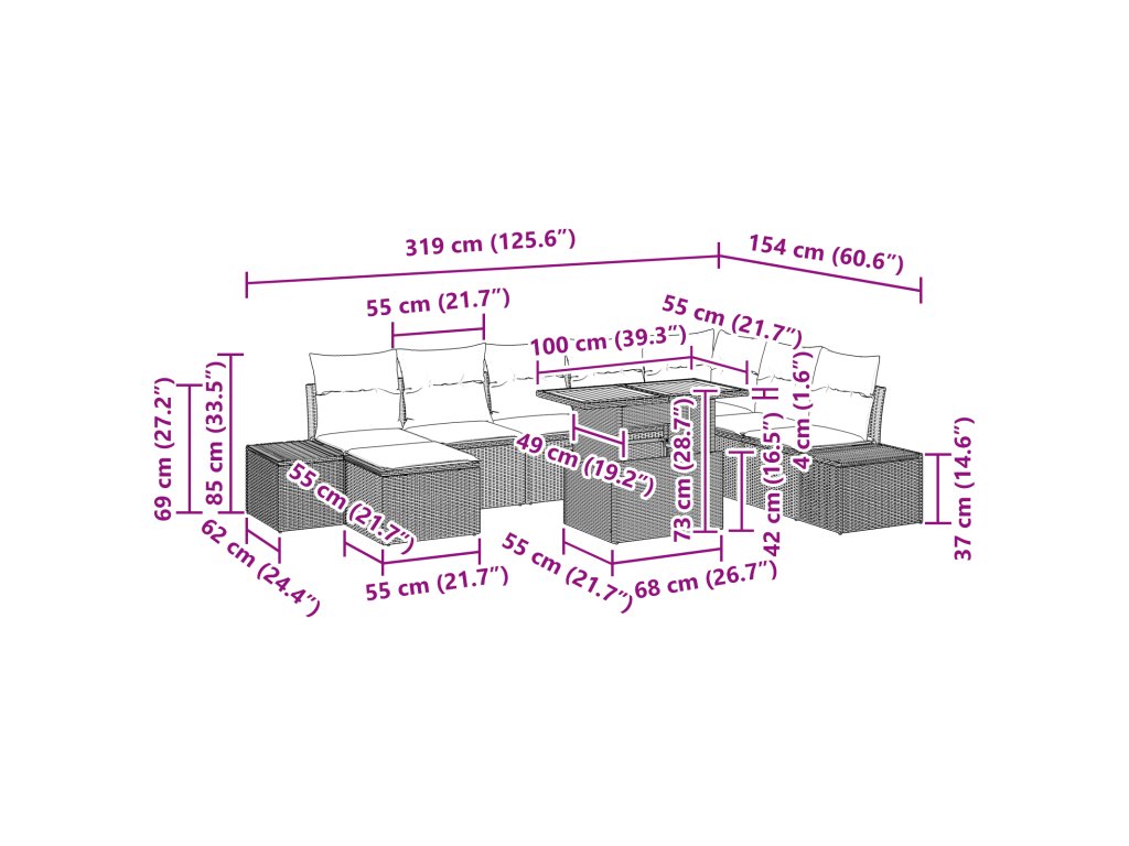 Kvalitní materiály: Vyrobená z vysoce kvalitního poly ratanu, tato všestranná souprava představuje důkaz odolnosti a elegantního designu, který snadno odolává UV záření. Rám z práškově lakované oceli zpevňuje její stabilitu, zatímco masivní akáciové dřevo dodává elegantní a přirozenou krásu. Tyto ideální kombinace materiálů zajišťují dlouhověkost a obohacují venkovní prostředí, harmonizují s přirozeným okolím a umělou estetikou. Praktický design: Soustředěná kolem modularity, každý kus může být nezávisle konfigurován tak, aby vyhovoval jakékoli příležitosti. Dvě boční pohovky, rohový sedák a čtyři centrální kusy nabízejí úložné možnosti, maximalizující jak prostor, tak užitnost. Tato přizpůsobivá sestava tak akomoduje měnící se potřeby, od konfigurací sezení po organizaci venkovních nezbytností, plynule se přizpůsobuje jakémukoli prostředí. Vynikající odolnost proti povětrnostním vlivům: Při zajištění odolnosti vůči elementům, tato zahradní souprava slibuje odolnost proti slunečnímu záření, lehkým přeháňkám a větru, udržujíc svou krásu a integritu během léta a jara. Její matný povrch dále zvyšuje její odolnost vůči opotřebení, uchovávající svůj vzhled i při každodenním vystavení. Tento atribut zajišťuje, že zůstane stálicí, nikde zanedbávána časem ani počasím. Pohodlná péče a montáž: Zacházejte s péčí, abyste prodloužili životnost. Chraňte soupravu ochrannými obaly, když se nepoužívá, abyste zachovali její živost a stav. Pro montáž, dva lidé se šroubovákem ji snadno sestaví, což vyústití v krásně praktickou sestavu, která vybízí k nepřetržitému odpočinku a radostným setkáním. Všestranné využití: Ideální pro zahrady, terasy a podobné otevřené prostory, kde tato souprava doplňuje různé krajiny. Její nenápadná elegance a rafinovaná funkčnost jí umožňují hladce přecházet od všedních jídel k víkendovým oslavám. Její design harmonicky ladí s jakýmkoli společenským setkáním nebo okamžikem osamělosti venku.- Barva: Černá a krémová