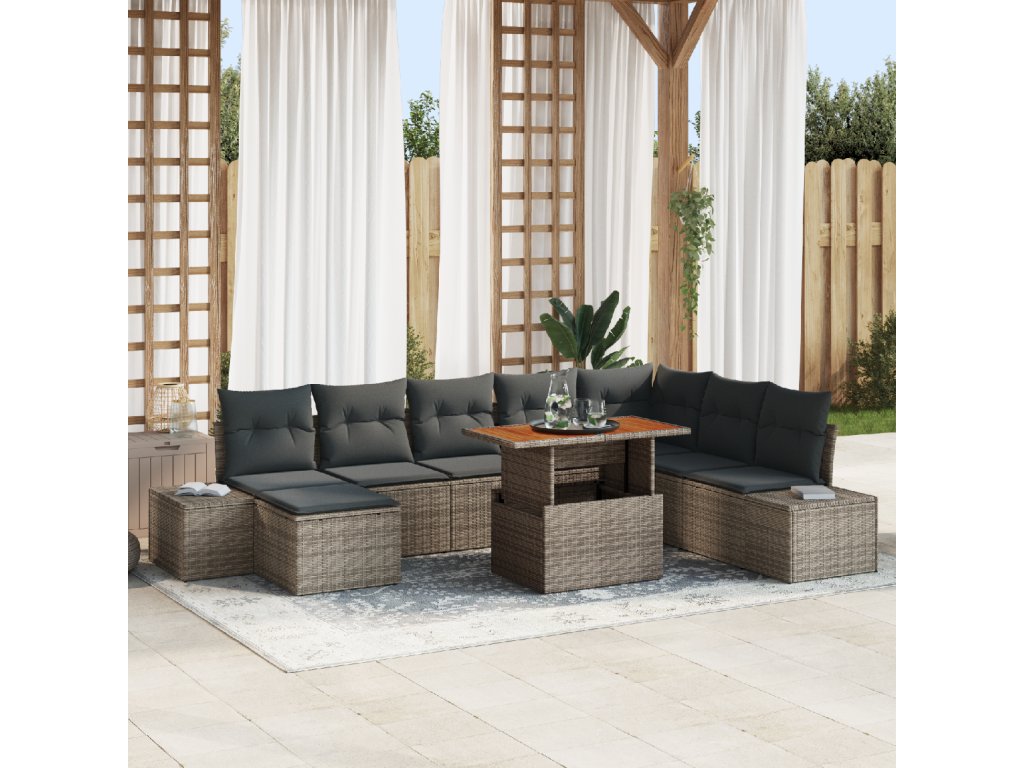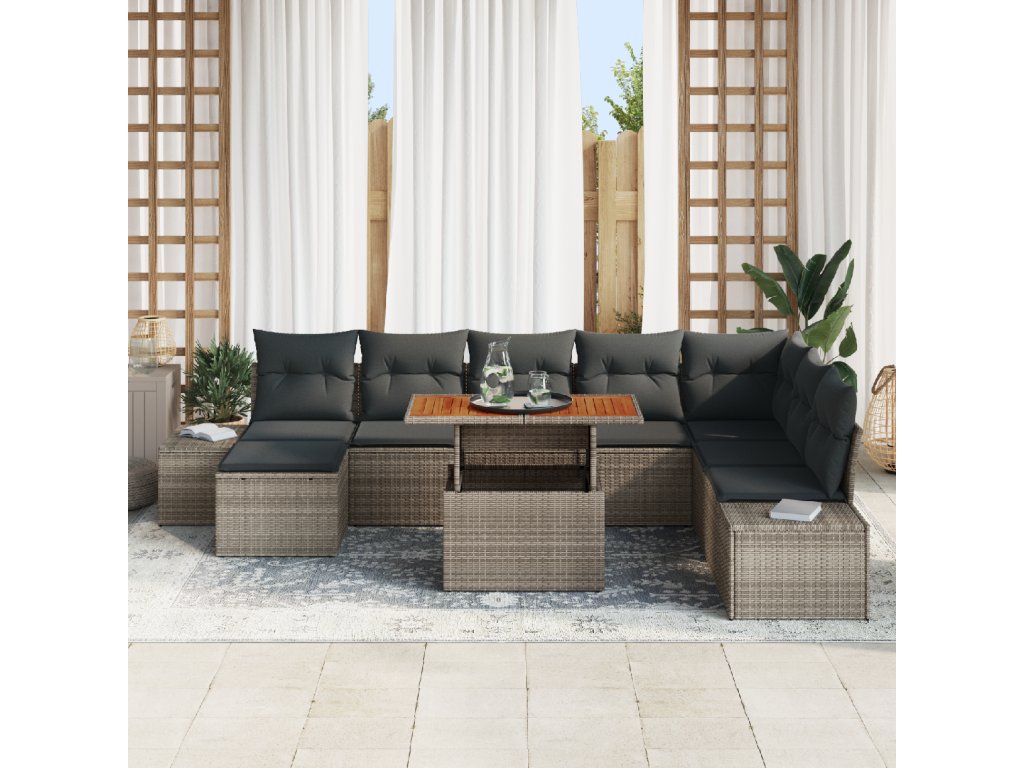 Kvalitní materiály: Vyrobená z vysoce kvalitního poly ratanu, tato všestranná souprava představuje důkaz odolnosti a elegantního designu, který snadno odolává UV záření. Rám z práškově lakované oceli zpevňuje její stabilitu, zatímco masivní akáciové dřevo dodává elegantní a přirozenou krásu. Tyto ideální kombinace materiálů zajišťují dlouhověkost a obohacují venkovní prostředí, harmonizují s přirozeným okolím a umělou estetikou. Praktický design: Soustředěná kolem modularity, každý kus může být nezávisle konfigurován tak, aby vyhovoval jakékoli příležitosti. Dvě boční pohovky, rohový sedák a čtyři centrální kusy nabízejí úložné možnosti, maximalizující jak prostor, tak užitnost. Tato přizpůsobivá sestava tak akomoduje měnící se potřeby, od konfigurací sezení po organizaci venkovních nezbytností, plynule se přizpůsobuje jakémukoli prostředí. Vynikající odolnost proti povětrnostním vlivům: Při zajištění odolnosti vůči elementům, tato zahradní souprava slibuje odolnost proti slunečnímu záření, lehkým přeháňkám a větru, udržujíc svou krásu a integritu během léta a jara. Její matný povrch dále zvyšuje její odolnost vůči opotřebení, uchovávající svůj vzhled i při každodenním vystavení. Tento atribut zajišťuje, že zůstane stálicí, nikde zanedbávána časem ani počasím. Pohodlná péče a montáž: Zacházejte s péčí, abyste prodloužili životnost. Chraňte soupravu ochrannými obaly, když se nepoužívá, abyste zachovali její živost a stav. Pro montáž, dva lidé se šroubovákem ji snadno sestaví, což vyústití v krásně praktickou sestavu, která vybízí k nepřetržitému odpočinku a radostným setkáním. Všestranné využití: Ideální pro zahrady, terasy a podobné otevřené prostory, kde tato souprava doplňuje různé krajiny. Její nenápadná elegance a rafinovaná funkčnost jí umožňují hladce přecházet od všedních jídel k víkendovým oslavám. Její design harmonicky ladí s jakýmkoli společenským setkáním nebo okamžikem osamělosti venku.- Barva: Šedá a hnědá