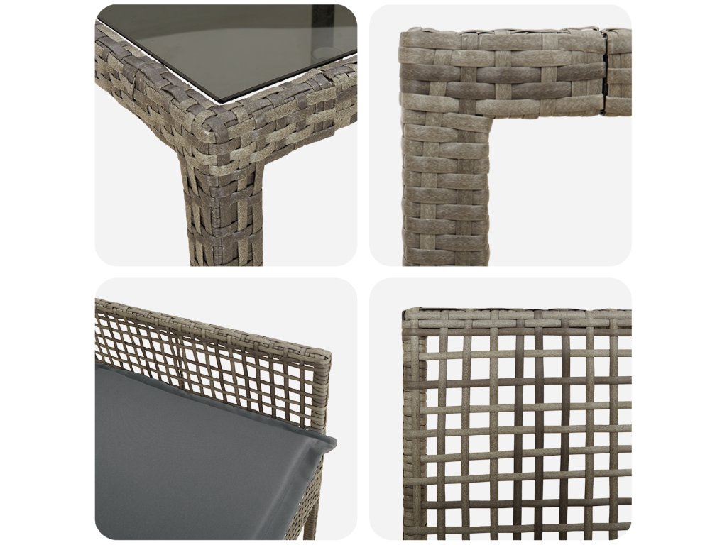 Vysoce kvalitní poly ratan: Tato souprava je vyrobená z odolného poly ratanu, který zvládá různý počasí a každodenní používání. Její tkaný vzhled dodává chic atmosféru, která se hodí do každé zahrady a dává vám pohodlí díky chytrému designu. Silný ocelový rám: Práškově lakovaný ocelový rám zajišťuje, že je tato souprava opravdu pevná. Nerezne a pořád vypadá skvěle, i když ji dost používáte, takže si milovníci venkovního posezení mohou v klidu odpočinout. Tvrzená skleněná deska: Vrchní deska z tvrzeného skla dodává moderní vzhled a bezpečnost. Odolává teplu a rozbití, takže je bezpečná pro jídlo nebo dekorace. Pohodlné sezení: Každé sedadlo má pěnový polštář se zipem, takže se snadno sundává a myje. Záda a opěrky rukou jsou z poly ratanu, což zajišťuje, že budete pohodlně odpočívat i po dlouhou dobu, ať už relaxujete nebo se bavíte s přáteli. Snadná údržba: Stačí otřít soupravu vlhkým hadříkem, abyste ji udrželi v božím stavu. Vyhněte se drsným chemikáliím a používejte kryty, když ji zrovna nepoužíváte, ať vám dlouho vydrží a vypadá svěže po všechny sezóny.- Barva: Šedá