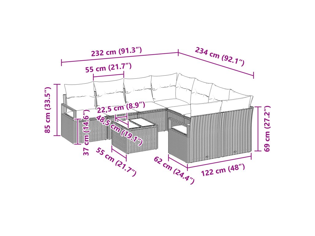 Materiál poly ratan: Luxusně navržená z poly ratanu, tato sedací souprava je nezařaditelná, protože odolává všem venkovním podmínkám a navíc vypadá skvěle. Tkaná textura zvyšuje estetičnost a zdůrazňuje pevnost vůči povětrnostním vlivům. UV-odolné vlastnosti poly ratanu ji dělají skvělou volbou pro sluncem zalité terasy, zachovávající eleganci během teplých měsíců. Zahrnutí základních komponentů: Tato sada obsahuje dvě rohová sedadla, čtyři střední sedačky, dvě arm sofa a stolek – každá část nabízí různé možnosti sezení. Ocelový rám zajišťuje stabilitu a pěnová výplň polštářů dává pohodlí. Tvrzené sklo na stolní desce nejen že zvyšuje styl, ale také přidává praktický prostor pro nápoje nebo dekorace. Praktické funkce: Sedací souprava je navržena pro dlouhou životnost a obsahuje odnímatelné sedací polštáře se zipem. Ploché opěrky pro ruce zjednodušují celkový design, ale poskytují také oporu. Každý prvek je lehký, ale robustní, což usnadňuje manipulaci. Tyto funkcionality zlepšují zážitek uživatele tím, že spojují funkčnost se stylovým provedením. Všestranné použití: Perfektní pro zahrady, verandu nebo terasy, tato sedací souprava provází různá venkovní dobrodružství – od klidného odpočinku po živé setkání. Obohatí různá prostředí a poskytne dostatek prostoru pro hosty, což z ní dělá ideální kousek pro neformální stolování i poklidné úniky. Bezstarostná údržba: Navržená pro snadnou péči, sada obsahuje jednoduché údržbové pokyny. Používejte kryty, když se souprava nepoužívá, aby byly materiály chráněny před tvrdými vlivy a uchovávaly si tak svou životnost. Pravidelně ji lehce čistěte, aby si zachovala prémiový pocit a minimalizovalo se opotřebení.- Barva: Černá a krémová
