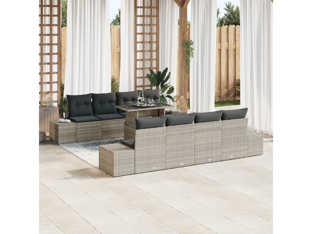 Materiály: Souprava je z kvalitního poly ratanu, odolného a vybraného pro dlouhou životnost v počasí. Tento materiál je praktický i stylový pro všechna roční období, vydrží slunce i déšť. Zahrnuté komponenty: Tenčí polštářky pro větší pohodlí, každé sedadlo je tak příjemné. Černý skleněný stůl přidává elegance a je praktický pro nápoje a jídlo. Silné ocelové rámce zajišťují stabilitu při používání, a tak je souprava pohodlná a zároveň vypadá skvěle. Funkce / design: Stůl s nastavitelnou výškou vám umožňuje volit mezi relaxačním posezením a formálním jídlem. Tohle je fajn pro hosty i čistě rodinné chvíle. Moderní vzhled se hodí do každého prostředí a dodává vašim zahradám nebo terasám šmrnc. Doporučené použití: Super pro venkovní posezení, terasy a patia. Souprava je přizpůsobivá, můžete ji snadno přestavět podle toho, koho máte zrovna na návštěvě. Její modulární styl vám umožňuje vlastně měnit složení kdykoliv potřebujete. Péče a údržba: Pro uchování jejího krásného vzhledu vydržujte potahy na nábytek, pokud ji nepoužíváte, a pravidelně ji utírejte suchým hadříkem. Tyto postupy zajistí dlouhou životnost materiálů a udržují soupravu stále atraktivní.- Barva: Světle šedá