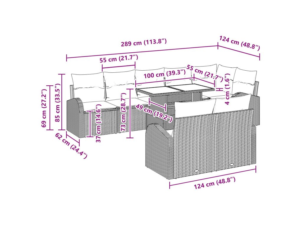 - 4 x křeslo: 124 x 62 x 85 cm (D x Š x V)