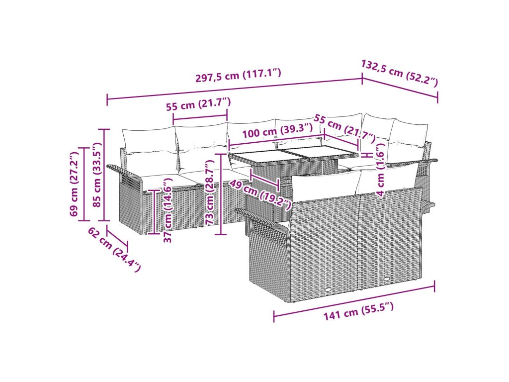 Odolné materiály Tato nábytková sada je vyrobená z kvalitního polyratanu a odolává blednutí, skvrnám, UV záření a vlhkosti. Robustní materiály zaručují dlouhou životnost, takže je to skvělá volba pro venkovní prostory. Součásti sady Tato komplexní sada zahrnuje rohové sedadlo, tři střední sedadla, čtyři křesla a stůl, všechny s pěkným provedením zadní strany. Navíc přicházejí s venkovními polštáři z odolné látky, která zajišťuje pohodlí a trvanlivost. Funkční prvky Povrch stolu z tvrzeného skla a ostatní díly jsou opatřeny práškovým lakem pro delší životnost. Manuální mechanismus umožňuje jednoduše přepnout výšku stolu z kávového na jídelní, což dodává flexibilitu. Doporučené použití Perfektní pro zahradu a terasu, přemění tyto prostory na útulné útočiště. Modulární design sady umožňuje různá uspořádání, a snadno se přizpůsobí vašim potřebám pro relaxaci nebo zábavu. Údržba Používejte kryt, když se nepoužívá, abyste prodloužili životnost. Údržba je jednoduchá a vyžaduje minimální úsilí, aby váš nábytek vypadal svěže a živě po celou sezónu.- Barva: Šedá