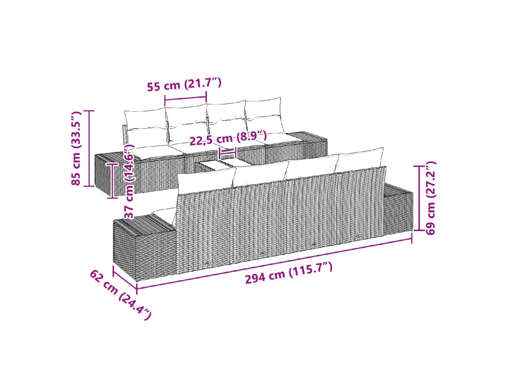 - 4 x Střední sedák: 55 x 62 x 69 cm (D x Š x V)
