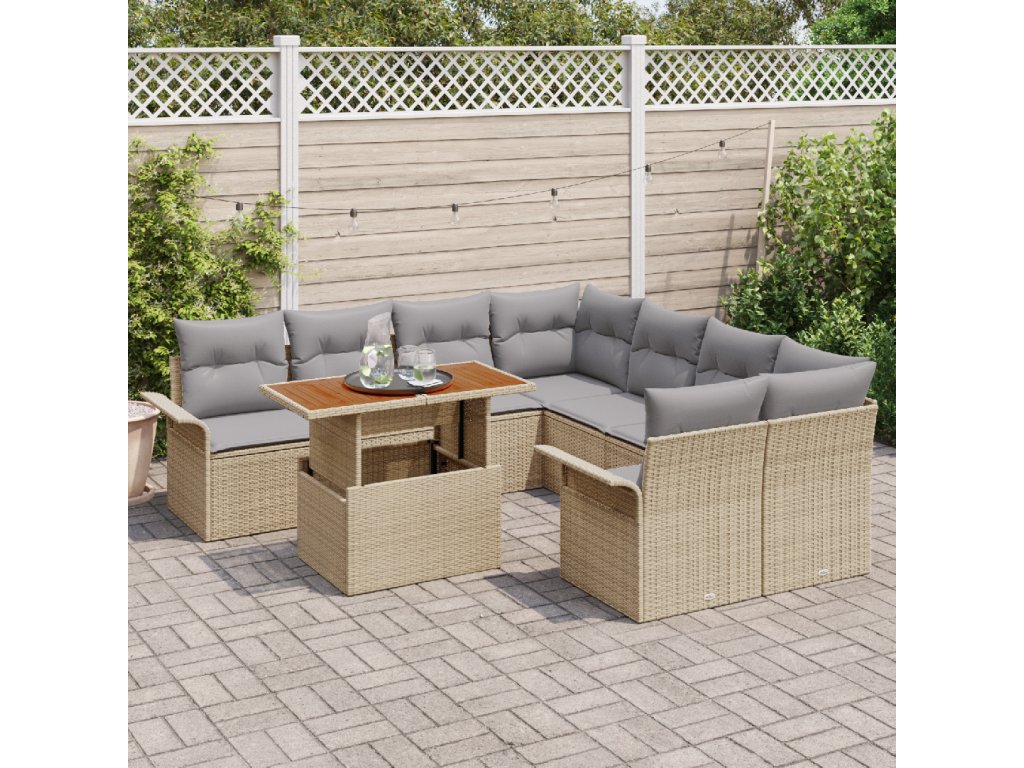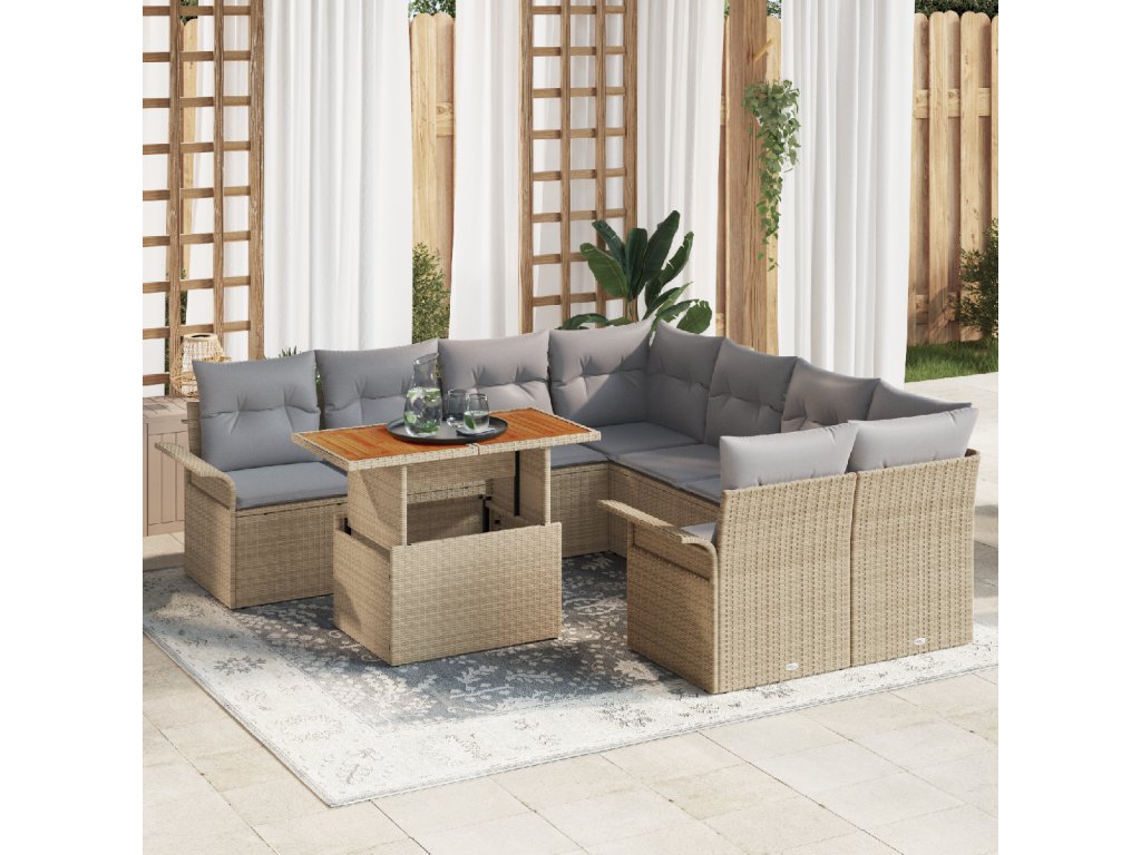 Tkaná textura: Užijte si eleganci a kouzlo tkaného polyratanu, který dodává charakter každému venkovnímu prostředí. Důmyslný tkaný vzor nejen zvyšuje vizuální přitažlivost, ale také přispívá k pohodlí a relaxaci nabízené touto zahradní sedací soupravou., Odolné komponenty proti počasí: Navrženo pro dlouhověkost venku, tato sada je vyrobena z UV-odolného polyratanu a práškově lakované oceli, což zajišťuje, že odolává tvrdému slunečnímu záření a různým povětrnostním podmínkám a přináší klid na duši pro dlouhodobé používání., Funkční design: S odnímatelnými a vyměnitelnými polštáři tato sada nabízí praktickou funkčnost. Společně s integrovanými možnostmi skladování v každém kusu zajišťuje, že budete udržovat uklizený a organizovaný venkovní prostor., Aestetická univerzálnost: Její moderní design s zakřivenými opěrkami rukou a povrchem z hnědé akácie se pohodlně snoubí s různými styly. Ať už v zahradě nebo na terase, povyšuje prostředí prostřednictvím svých přizpůsobivých vzhledů., Péče a údržba: Mějte klid, protože péče je jednoduchá. Otřete vlhkým hadříkem nebo použijte obal, když není používán, abyste zachovali jeho stav, zajišťující, že váš nábytek vždy vypadá jako nový. Pohodlné pokyny pro péči činí údržbu snadnou i pro zaneprázdněný životní styl.- Barva: Béžová a světle šedá