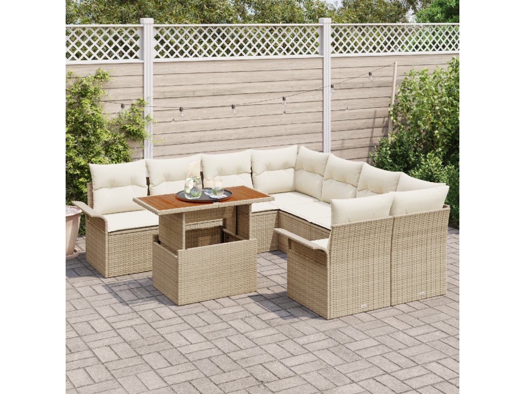 Tkaná textura: Užijte si eleganci a kouzlo tkaného polyratanu, který dodává charakter každému venkovnímu prostředí. Důmyslný tkaný vzor nejen zvyšuje vizuální přitažlivost, ale také přispívá k pohodlí a relaxaci nabízené touto zahradní sedací soupravou., Odolné komponenty proti počasí: Navrženo pro dlouhověkost venku, tato sada je vyrobena z UV-odolného polyratanu a práškově lakované oceli, což zajišťuje, že odolává tvrdému slunečnímu záření a různým povětrnostním podmínkám a přináší klid na duši pro dlouhodobé používání., Funkční design: S odnímatelnými a vyměnitelnými polštáři tato sada nabízí praktickou funkčnost. Společně s integrovanými možnostmi skladování v každém kusu zajišťuje, že budete udržovat uklizený a organizovaný venkovní prostor., Aestetická univerzálnost: Její moderní design s zakřivenými opěrkami rukou a povrchem z hnědé akácie se pohodlně snoubí s různými styly. Ať už v zahradě nebo na terase, povyšuje prostředí prostřednictvím svých přizpůsobivých vzhledů., Péče a údržba: Mějte klid, protože péče je jednoduchá. Otřete vlhkým hadříkem nebo použijte obal, když není používán, abyste zachovali jeho stav, zajišťující, že váš nábytek vždy vypadá jako nový. Pohodlné pokyny pro péči činí údržbu snadnou i pro zaneprázdněný životní styl.- Barva: Béžová a krémová