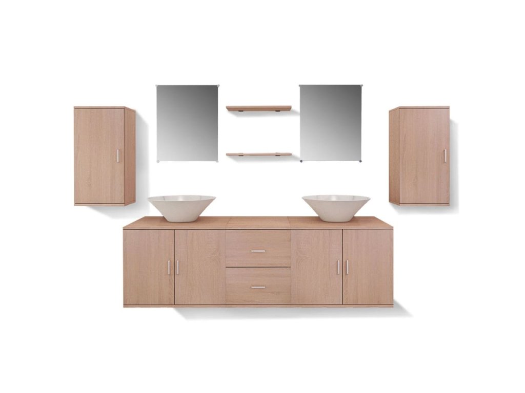 Tento kompletní set, sestávající z 1 nástěnné skříňky pod umyvadlo, 2 nástěnných skříněk, 2 zrcadel, 2 polic a 2 umyvadel, je skvělá volba pro vaši koupelnu. Optimalizuje dostupný prostor, aniž byste museli slevovat ze stylu.