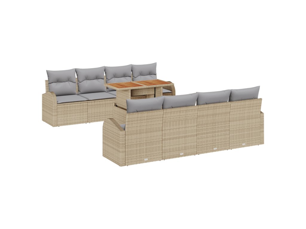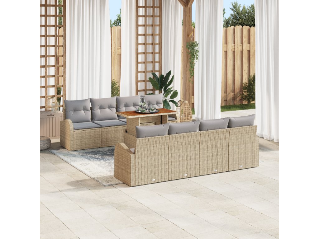 Kvalitní materiály: Set je vyroben z kvalitního poly ratanu pro silný a hezký vzhled. Rám z práškově lakované oceli mu dodává dlouhou životnost a masivní akáciová deska stolu dodává přírodní prvek, který se perfektně hodí do exteriéru. Kompletní součásti: Součástí jsou dvě sofa pro dva, každé s poly ratanovou opěrkou, a čtyři centrální sedačky s úložným prostorem. A nezapomínejme na zahradní stůl, kde je dost místa na jídlo a další věci. Funkční vlastnosti: Materiály odolné proti UV záření zvládají slunce, takže to přečká roky. Odnímatelné polštáře usnadňují údržbu. Variabilní použití: Perfektní pro zahrady a terasy, jeho flexibilní design vám umožní upravit uspořádání sezení, jak jen chcete – ať už jde o velkého shromáždění nebo klidné večery. Moderní vzhled se hodí k současným venkovním stylům. Péče a údržba: Jednoduše utřete vlhkým hadříkem, aby byl set pořád hezký. V offseason ho zakryjte ochranným potahem, abyste ho ochránili před počasím, a tak vydrží dlouho jako nový.- Barva: Béžová a světle šedá