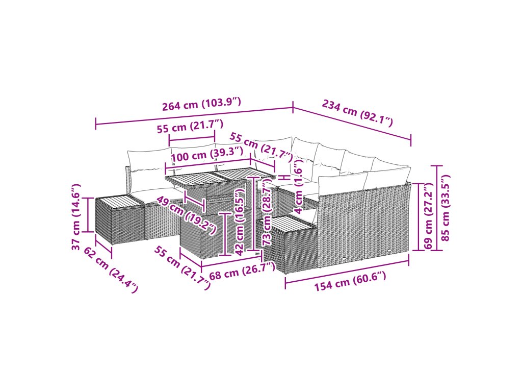 Kvalitní materiály Set se skládá z robustní kombinace práškově lakované oceli a masivního akáciového dřeva, které poskytuje odolnou konstrukci, jež odolává povětrnostním vlivům, a zároveň nabízí moderní, sofistikovaný vzhled. Poly ratanový výplet dodává přirozenou texturu a je odolný vůči UV záření, což z něj činí skvělou volbu pro dlouhodobé venkovní užití. Tato kombinace materiálů zajišťuje jak vizuálně přitažlivý, tak funkční produkt, který obohacuje jakoukoli zahradní plochu. Funkční komponenty Set je vybaven dvěma bočními pohovkami, dvěma rohovými sedacími částmi a čtyřmi centrálními sedadly, z nichž každé zahrnuje funkci úložného prostoru, což prakticky usnadňuje úsporu místa a zároveň poskytuje pohodlné sezení. Ergonomická opěrka zad, sedací polštáře a madla zajišťují pohodlí při dlouhodobém užití, zatímco odnímatelné potahy polštářů přidávají praktičnost pro čištění a údržbu. Funkce Modulární designové prvky umožňují konfigurovat set podle vašich specifických potřeb a preferencí, což z něj činí přizpůsobitelnou volbu pro různé příležitosti. Nastavitelné nožičky zajišťují také stabilitu na nerovných plochách, což zvyšuje celkovou užitečnost setu. Tato flexibilita činí set doporučovaným doplňkem do jakéhokoli dynamického venkovního prostředí. Univerzální využití Ideálně navržený pro venkovní scénáře, tento jídelní set se snadno vejde na zahradní terasy a patia, poskytující centrální místo pro letní a jarní setkání. Jeho různorodé možnosti sezení nabízejí versatility pro společenské akce nebo klidné trávení volného času, což činí tento nábytek vhodnou volbou pro různé venkovní uspořádání a příležitosti. Údržba Je nezbytné používat kryt pro ochranu, když se set nepoužívá, aby váš nábytek udržel svou prvotřídní kvalitu po léta. Pravidelná péče s jednoduchými obaly pomáhá zachovat trvanlivost a vzhled i za nejnáročnějších venkovních podmínek. Tato praktická péče zajišťuje, že váš jídelní set zůstane pozvánkou a funkčním nábytkem tak, jak byl den, kdy dorazil.- Barva: Černá a béžová