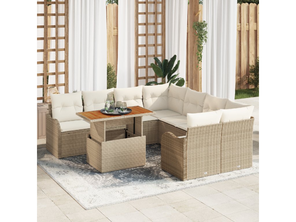 Materiály: Tenhle zahradní sofa set je z polyratanu, což je známý materiál, který vydrží venkovní podmínky. Rám z práškově lakované oceli je pevný a stabilní. Desky z masivního akáciového dřeva dotvářejí přirozený a elegantní vzhled, což zaručuje roky stylu a užívání. Kombinace těchto materiálů znamená, že set je dost silný i při změnách počasí, a je skvělou volbou pro milovníky venkovního bydlení. Součásti: Set obsahuje dva dvojsedáky, čtyři středové sedačky a zahradní stůl, což vám dá spoustu variant pro pohodlné uspořádání. Každé sofa má pohodlné a odolné polštáře pro venkovní použití. Zakřivené opěrky rukou a tvar zadní části sofa se postarají o pohodlí a styl. Vlastnosti / Funkce / Design: Design má materiály, které odolávají UV záření, takže si uchovávají svůj vzhled i při silném slunečním svitu. Odnímatelné polštáře usnadňují údržbu, takže je jednoduché je vyčistit nebo vyměnit. Kromě toho zakřivené opěrky rukou a pohodlné materiály dodávají příjemný pocit. Doporučené použití: Perfektní pro venkovní použití v zahradách, na terasách nebo slunných dvorech; tenhle set je ideální na jarní a letní akce. Je dost flexibilní, aby se přizpůsobil různým uspořádáním, takže ho snadno můžete upravit z uvolněného místa pro rodinu na elegantní zábavní prostor. Péče a údržba: Pro údržbu je nejlepší použít ochranný kryt, když se set nepoužívá. Pravidelně otírejte vlhkým hadříkem, aby set vypadal skvěle, a to i při různých povětrnostních podmínkách.- Barva: Béžová a krémová