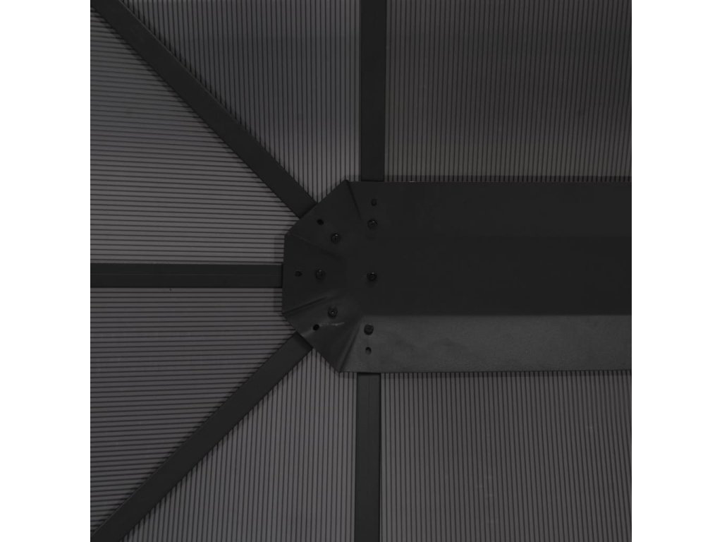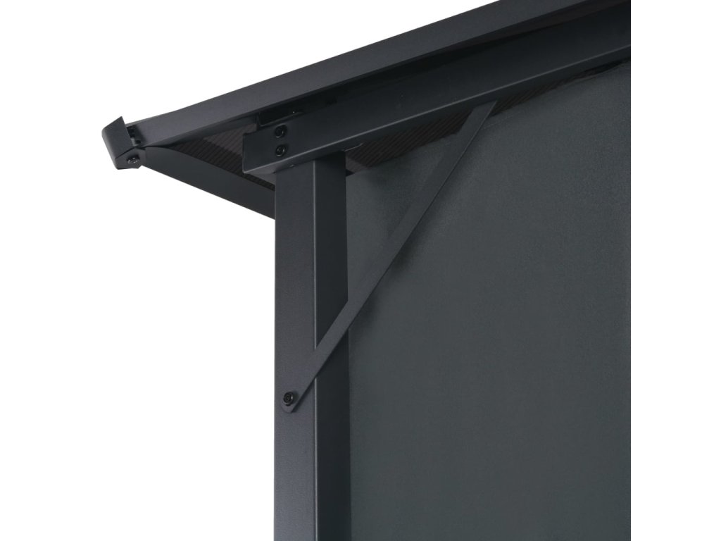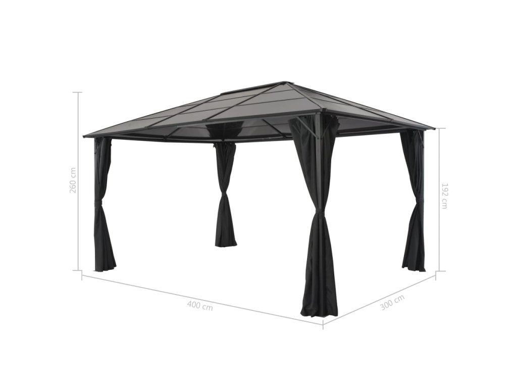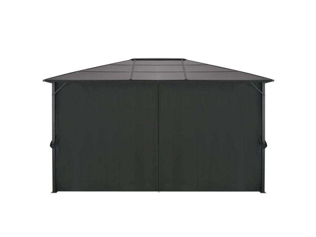 Střecha je vyrobena z 6 mm silných polykarbonátových desek a ochrání vás jak před žárem, tak i před škodlivými UV paprsky přímého slunečního záření. Altán má pevnou konstrukci z pevného hliníku a oceli, a proto nerezaví a je mimořádně stabilní. Disponuje rovněž 4 bočními stěnami, které můžete zatáhnout v případě nevlídného počasí. Pro jednoduché uvázání závěsů najdete na altánu poutka na suchý zip.