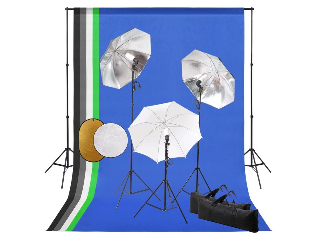 Ateliérové vybavení lampy, deštníky, pozadí a odrazná deska
