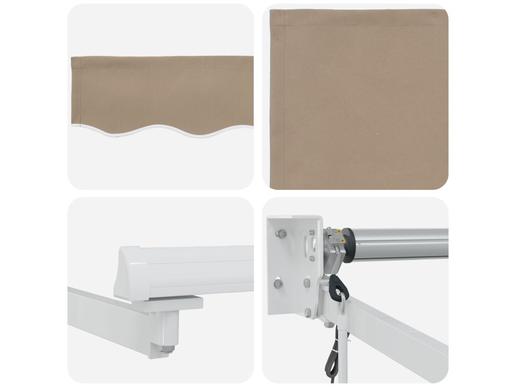 - Materiály: Polyester a hliník zaručují odolnost a dlouhou životnost. Polyesterová látka se nebojí slunce a zachovává si svou barvu. Hliníková konstrukce je lehká a stabilní, takže je snadné ji namontovat.