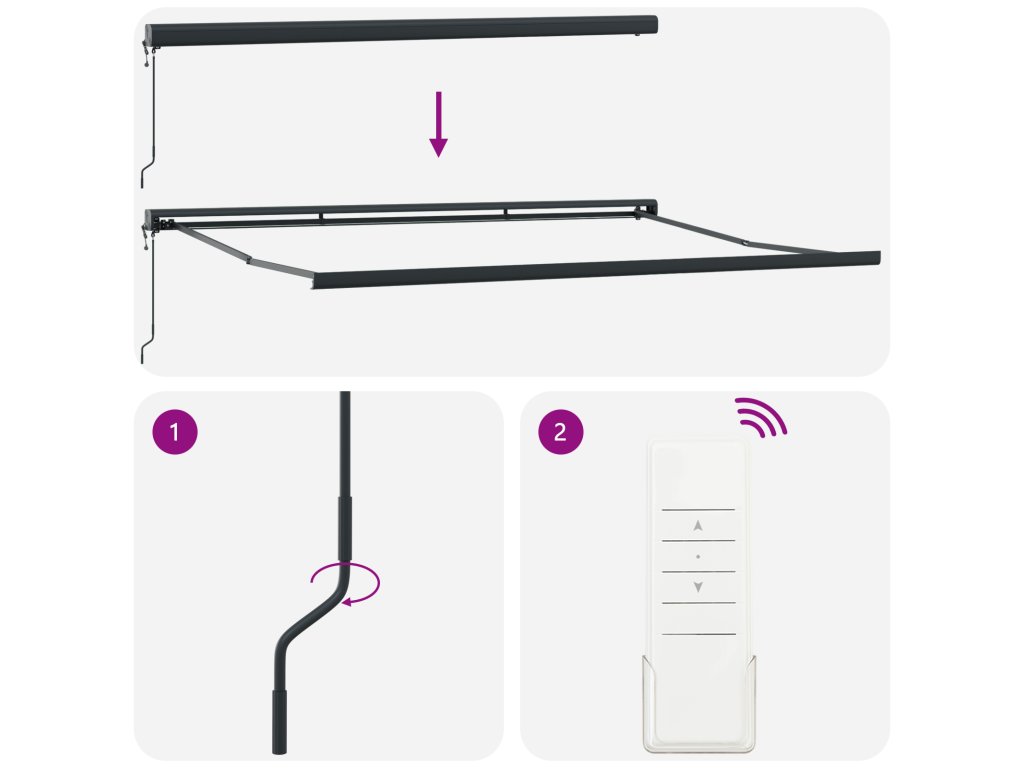 - Teleskopická technologie: Rozšiřte nebo stáhněte svou markýzu díky pokročilé teleskopické funkci. To zaručuje hladké přechody mezi otevřenými a zavřenými stavy, které se dobře zabezpečují pro optimální funkčnost. Užijte si jednoduchý provoz, zatímco si přizpůsobujete prostor pro zábavu nebo relaxaci venku.
