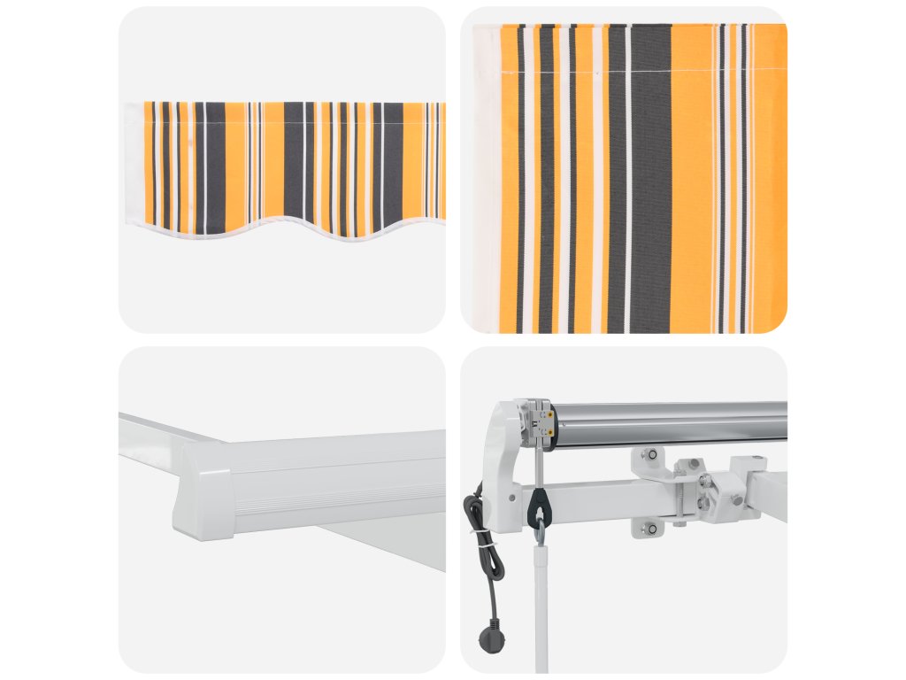 - Kvalitní tkanina: Vyrobena ze 100% polyesterového plátna, markýza je vysoce odolná a vydrží všechny povětrnostní vlivy. Tkanina zaručuje pohodlný stín i za slunečného počasí a svým výkonem je ideální pro časté používání v létě.